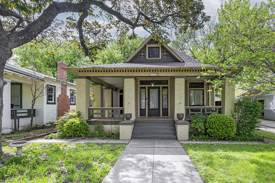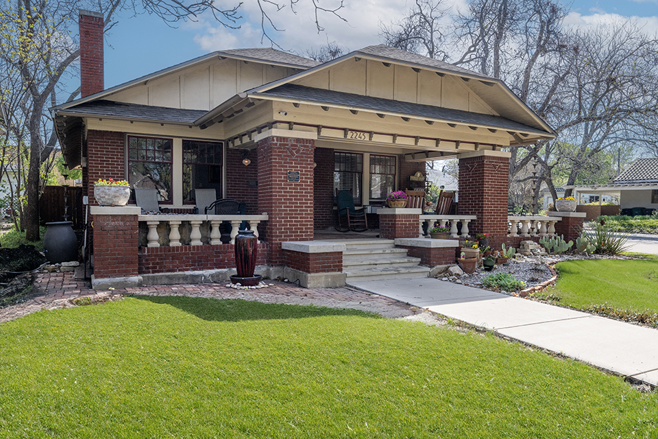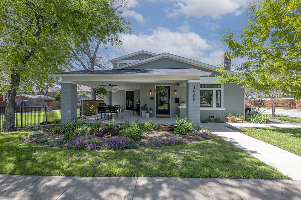 The unusual jerkinhead, or clipped gable, rooflines are a unique feature with a concrete wraparound porch. Along the eaves are rows of unusual stepped corbels, an early art deco feature. Inside, the house has wonderful family antiques and some great artwork by Fort Worth artists, including a well-known local architect responsible for the early restoration of some key historic buildings on nearby West Magnolia Avenue, including the beautifully restored Mehl Building at Magnolia and Henderson Street.