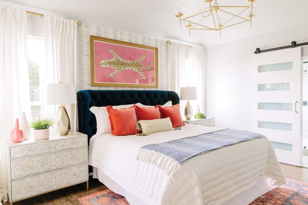 The bedroom also is an oasis of neutrals, save for the pop of a blue velvet tufted headboard, vibrant throw pillows on the bed and a colorful rug.
