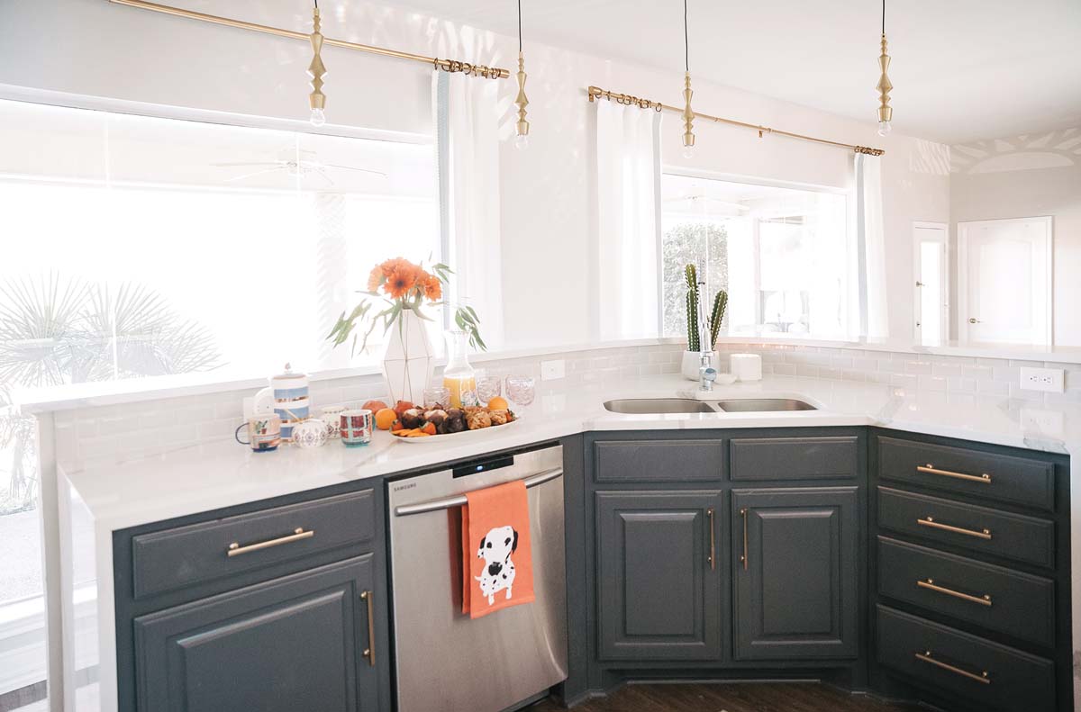 “Lighten up” was the design mantra, so all the rooms were painted in Repose Gray from Sherwin-Williams, a soft neutral. The same color was used on the built-in bookcases in the living room for a seamless look. White subway tile and white quartz counters replaced a dull tile backsplash and predictable dark brown granite in the kitchen, where the cabinets were painted in contrasting tones of white and dark gray. White window coverings were used everywhere, from the new lounge to the master bedroom to Gary’s TV room. And the master bath got a wow makeover, becoming a spalike retreat complete with a glassed-in “wet room” featuring gray-and-white Kelly Wearstler/Ann Sacks stone mosaic tile. Gold-tone accents, from drawer pulls to curtain rods to pendant lights, are found throughout the home.