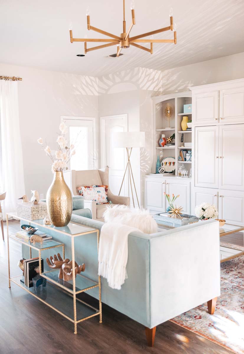 An oversize leather sectional and animal prints gave way to smaller-scaled pieces upholstered in neutral colors. That’s not to say Shauna didn’t add her trademark punches of color and texture with functional pieces such as a blue lacquer buffet in the lounge and woven-leather dining chairs. Vibrant area rugs are used everywhere. Wallpaper with hints of metallic sheen provides a bit of glamour.