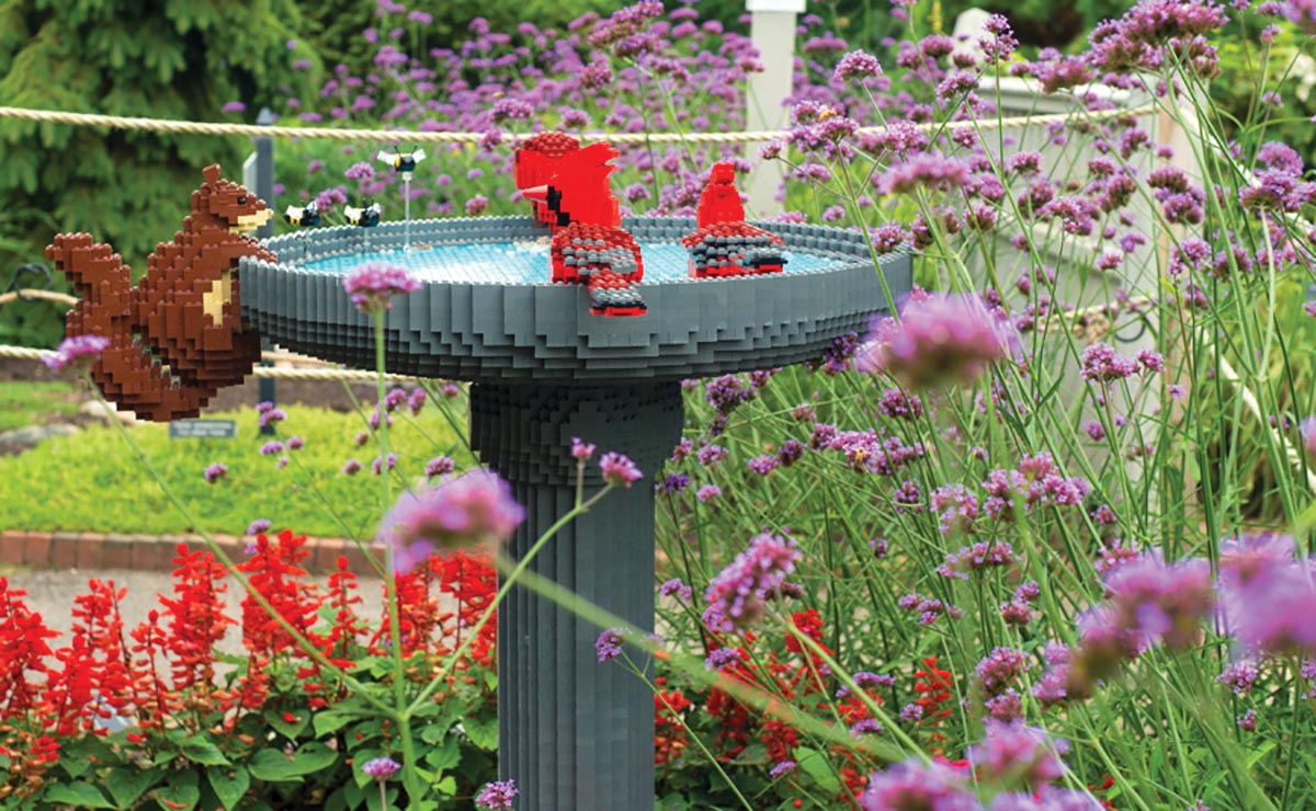 Kenney’s Lego brick birdbath is enlivened by a squirrel and redbirds.