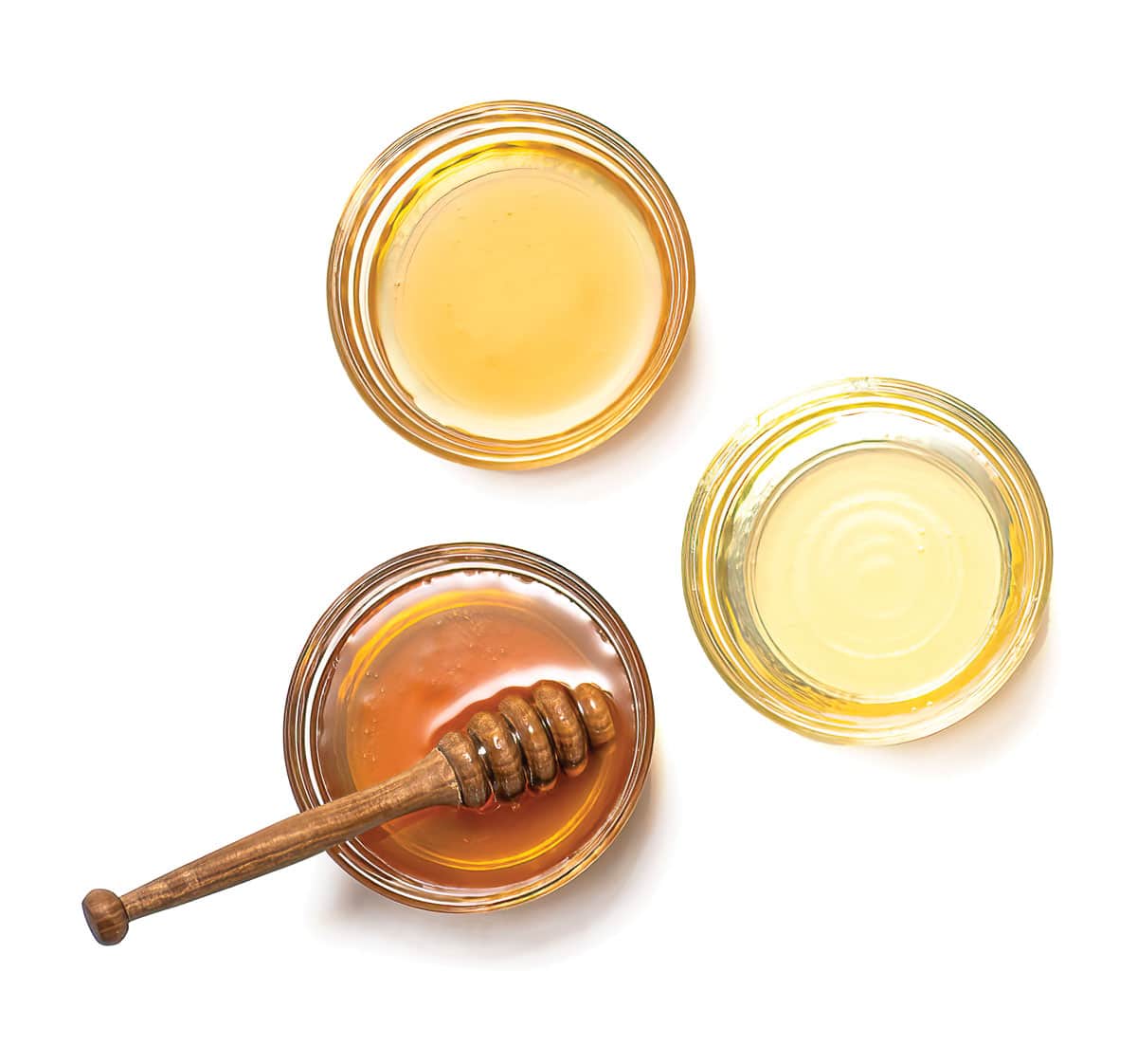 Colors and flavors vary from the almost transparent acacia honey to the golden, lightly sweet product of mesquite and the amber/rich brown “dark” honeys from buckwheat, manuka, thyme and wildflowers. The darker the honey, the more pungent the flavor and higher the level of nutrients.