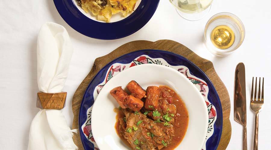 Remove brisket from pot, allow to cool slightly, then cut on the bias, against the grain, into ¼-inch slices. Place brisket back into pot, assembling it back into its original shape.