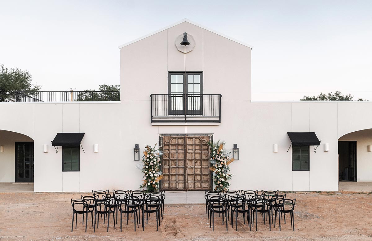 Experience a new breed of venue at this Modern Mexican Private Event Center with mission style white stucco grand entrance. From the antique cast iron bell, hundreds year old European imported teak doors to the handmade ceramic lighting and rooftop deck, the Lazy S Hacienda is a place where guests can easily flow throughout the space and delight in the curated decor that is all one of a kind.
