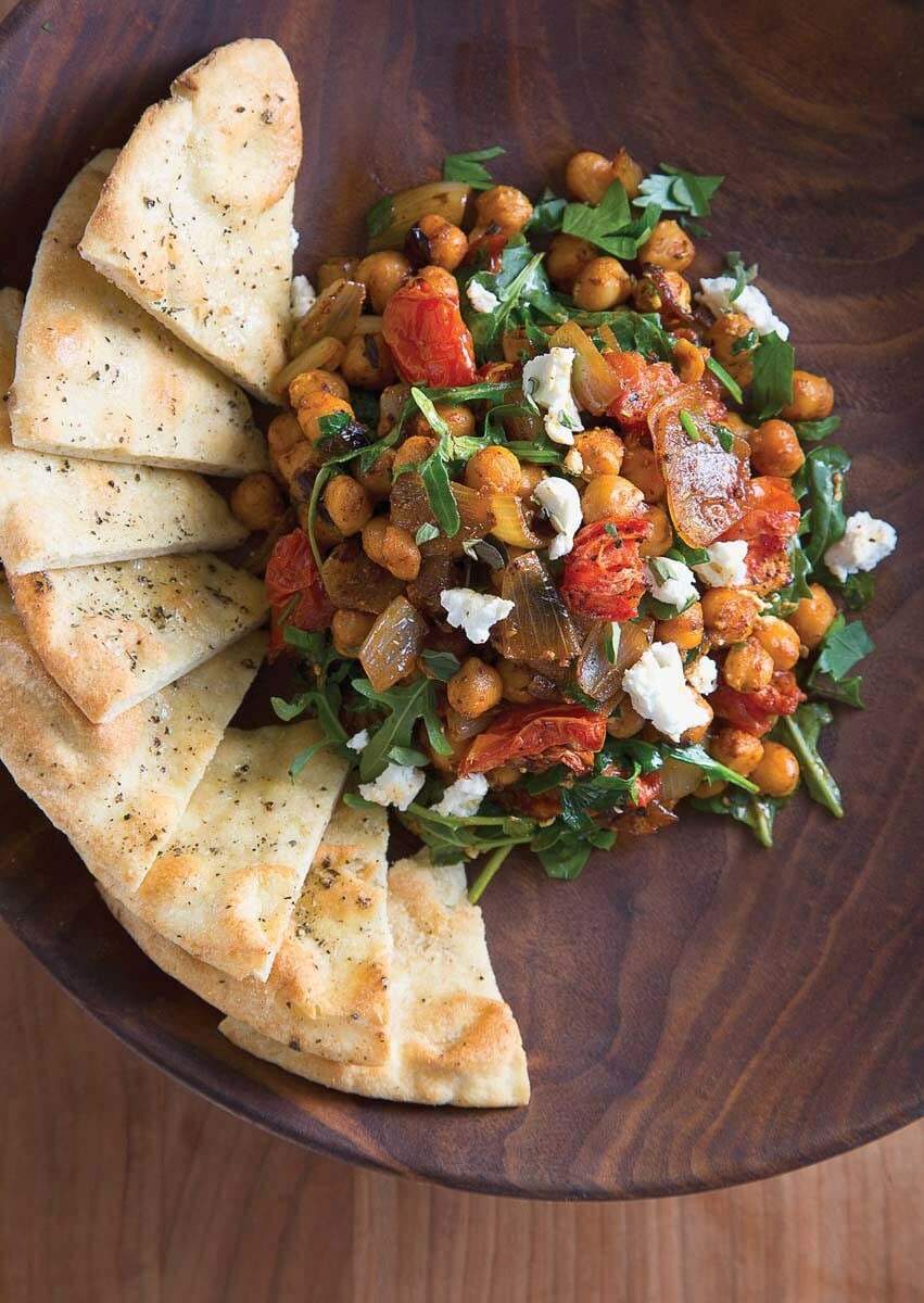 Transfer the chickpeas to a serving platter or shallow bowl and crumble the remaining goat cheese over the top. Serve with pita bread.