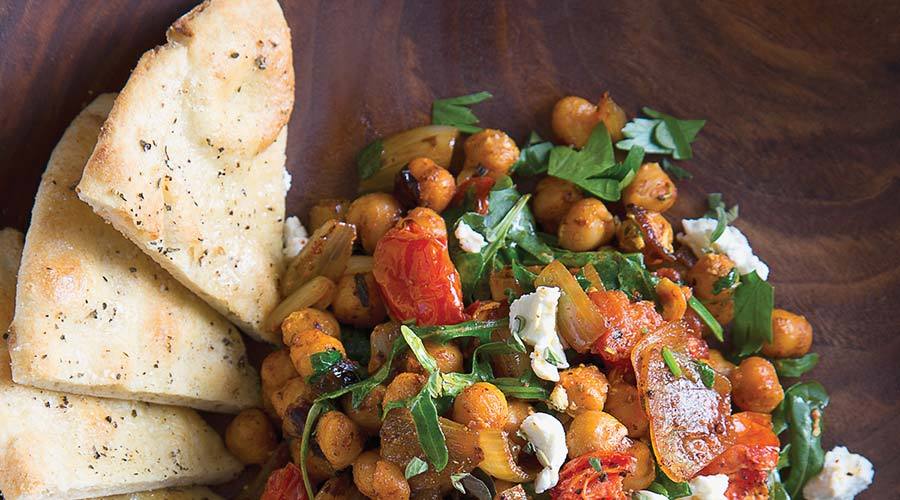 This recipe appeared in our April 2009 issue, and it’s worth repeating. Whole chickpeas seared in spicy achiote oil, mixed with roasted tomatoes and goat cheese, are served with toasted pita bread. The dish is filling on its own, but it also partners well with grilled chicken or lamb chops. Find a variation at chef Lou Lambert’s Austin restaurant, Lamberts Downtown Barbecue.