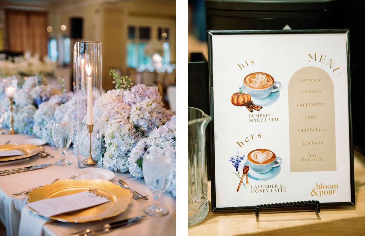 Complemented by an abundance of candles setting the mood, florals were the star of the show in this wedding. Rosie’s Floral Design pulled off the bride’s dream, two 50-foot hydrangea waterfall pieces which donned the two head tables. “I was obsessed and felt like I was in a garden,” Addison says. “I then did blooms on the stage, bar, cake table and mantle, and church altar. We also did twelve high centerpieces and reused bridesmaids bouquets for the other twelve.”