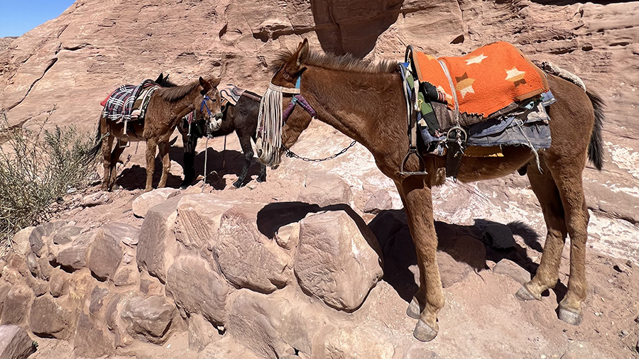 Although it’s possible to walk, and many do, we were happy to be riding in our donkey convoy, led by Alsamahin on his horse — mostly because the long, steep trail includes a switchback-filled network of 800 or so irregularly shaped natural stone stairs. But our donkeys were pros, and soon we were, too, thanks to Alsamahin’s advice of leaning back for the ascent and forward for the descent (and holding the reins tightly at all times). Along the way, souvenir vendors lined the stairways, selling jewelry, magnets and such, and he helped us negotiate for several hand-embroidered scarves made by a local women’s craft collective, the Nabataean Ladies.