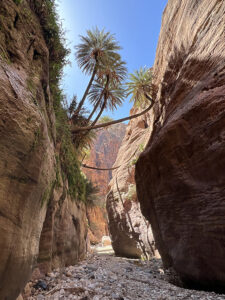 Palm trees sprout from the walls in the Wadi Ghuweir river valley.