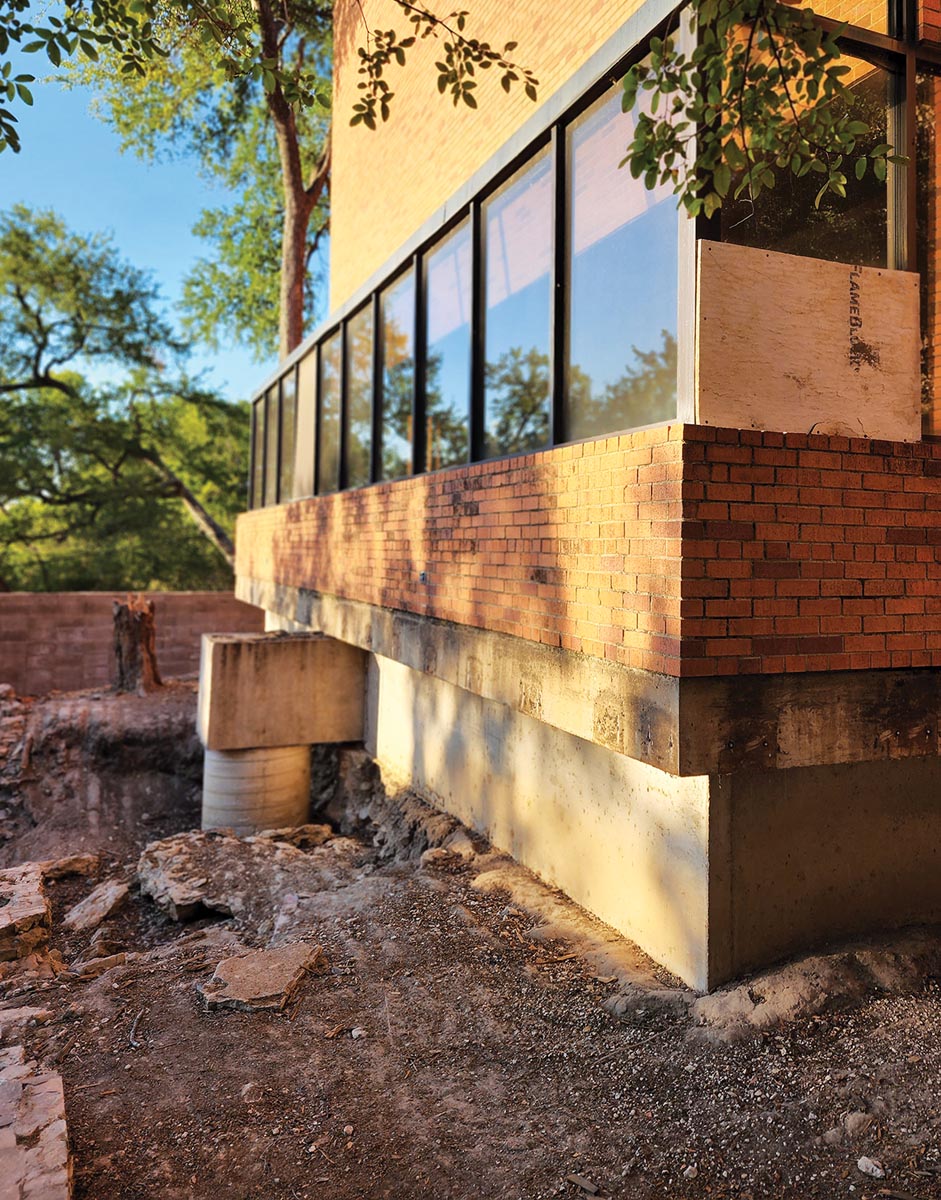There’s work to be done, but the building itself is remarkably sound structurally, and the exterior brick, the backside of which is exposed as the interior walls, shows little visible wear and tear; concrete floors are smooth and free of cracks. A wide stairwell on the north side of the building connects the three floors. The views from every floor, especially to the west and north, offer scenic overlooks of the tree-shaded acreage sloping toward the Trinity River. Plans include the addition of a glass-walled elevator on the north wall that will allow riders a chance to enjoy the vista. Massive floor-to-ceiling single-pane windows will be replaced with energy-efficient glass.