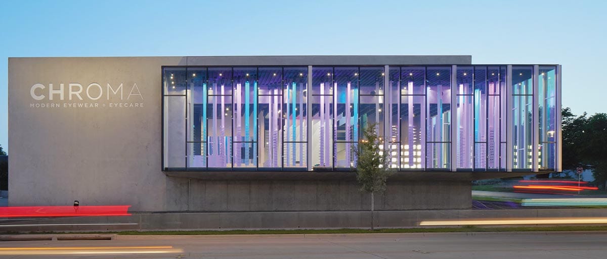 Ibañez Shaw Architecture ibanezshaw.com Client Matt Barber’s optical company now makes its home in an eye-catching steel, concrete and glass building near Fort Worth’s Cultural District. Built on a sloped lot, Chroma is made up of an open retail space in the glass-walled front with private examination rooms laid out in the back, where a solitary sliver of a window illuminates the employee break room. An open-air metal bridge leads from the parking lot to the front door; inside, a series of metal fins in ombre hues of purple mark the reception desk. Photos courtesy of Ibañez Shaw Architecture