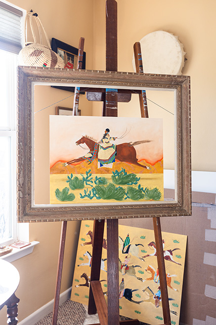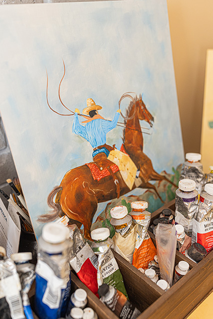 “It completely struck me,” she says. “His art brought back all the Western movies I watched with my father growing up. I knew instantly — I had to paint the West.