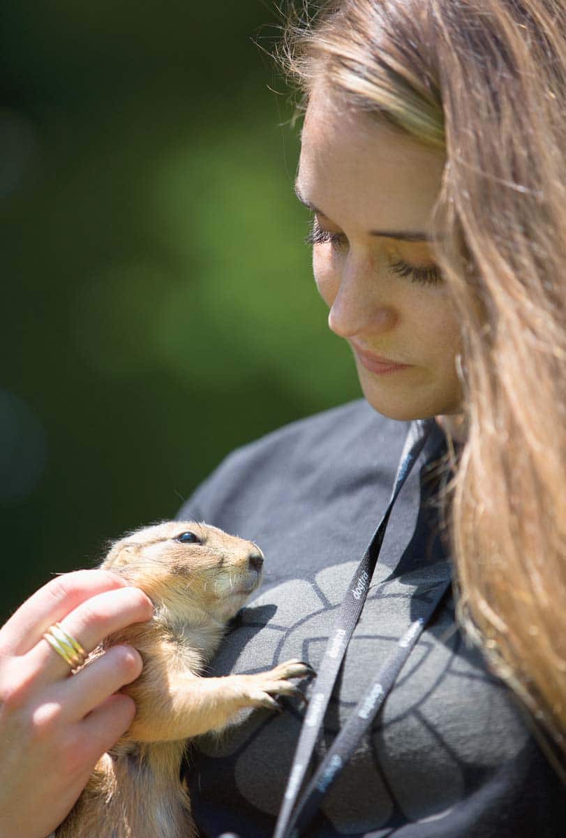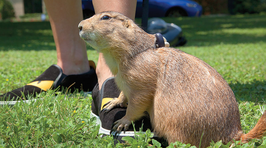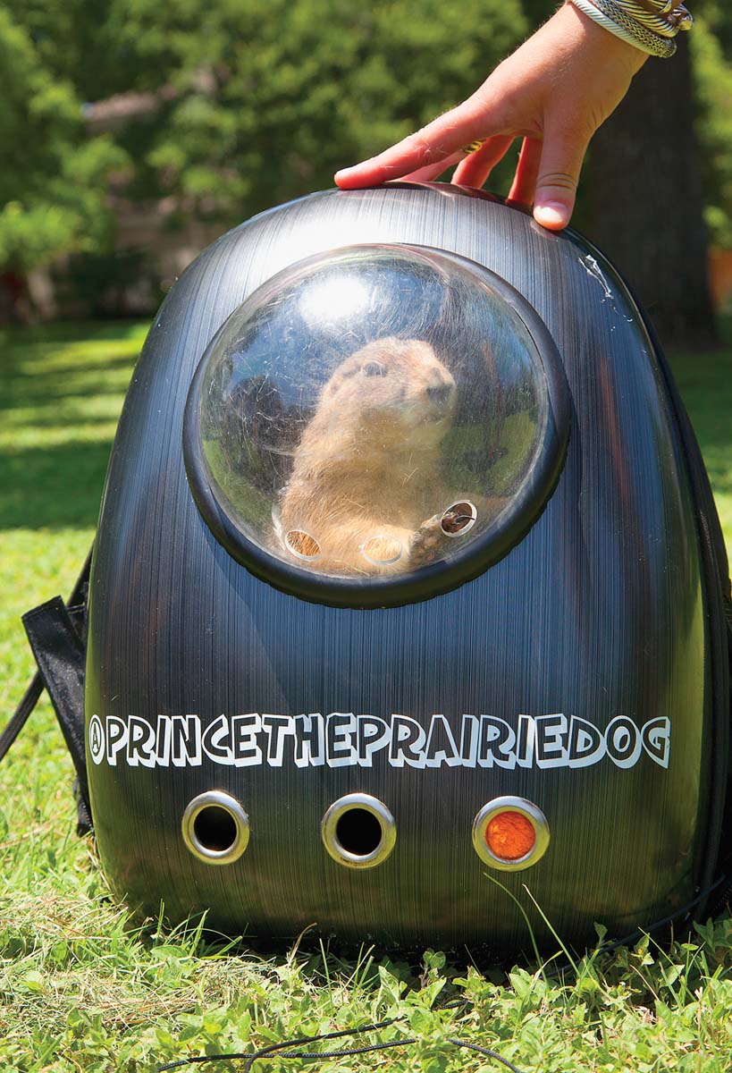 “Prairie dogs don’t have good depth perception, so we have to make sure Prince isn’t left alone in a place where he could fall and hurt himself,” says Taylor. “He thinks he’s a small dog. He uses the doggy door at home to go into the backyard and is comfortable with us at public places.” Prince has a little harness and leash, along with a special “bubble” backpack carrier that allows him to look out of a big plastic window.