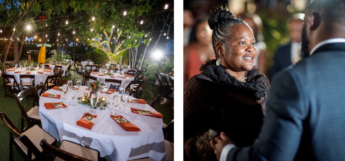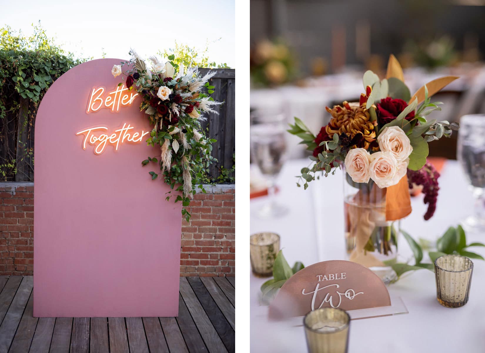 During the reception, the garden was illuminated with hanging string lights. They played their favorite music to set the tone for dinner, and the patio served as a dance floor. The photo booth from Capture Co. was a big hit among guests. It was a last-minute splurge, and Beverly was really pleased with how it turned out. The Styled Affair installed the backdrop with a neon sign that said “Better Together,” and Posh and Prim added flowers to bring it all together.