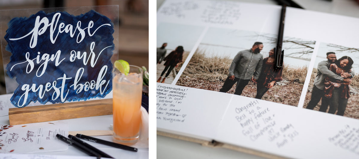 The couple chose their invitations from Brown Fox Creative because they liked the shape and color of the paper. Their detail cards brought in more color to work in the art elements of their theme. Geoffrey designed the welcome, seating chart and drink menu signs.