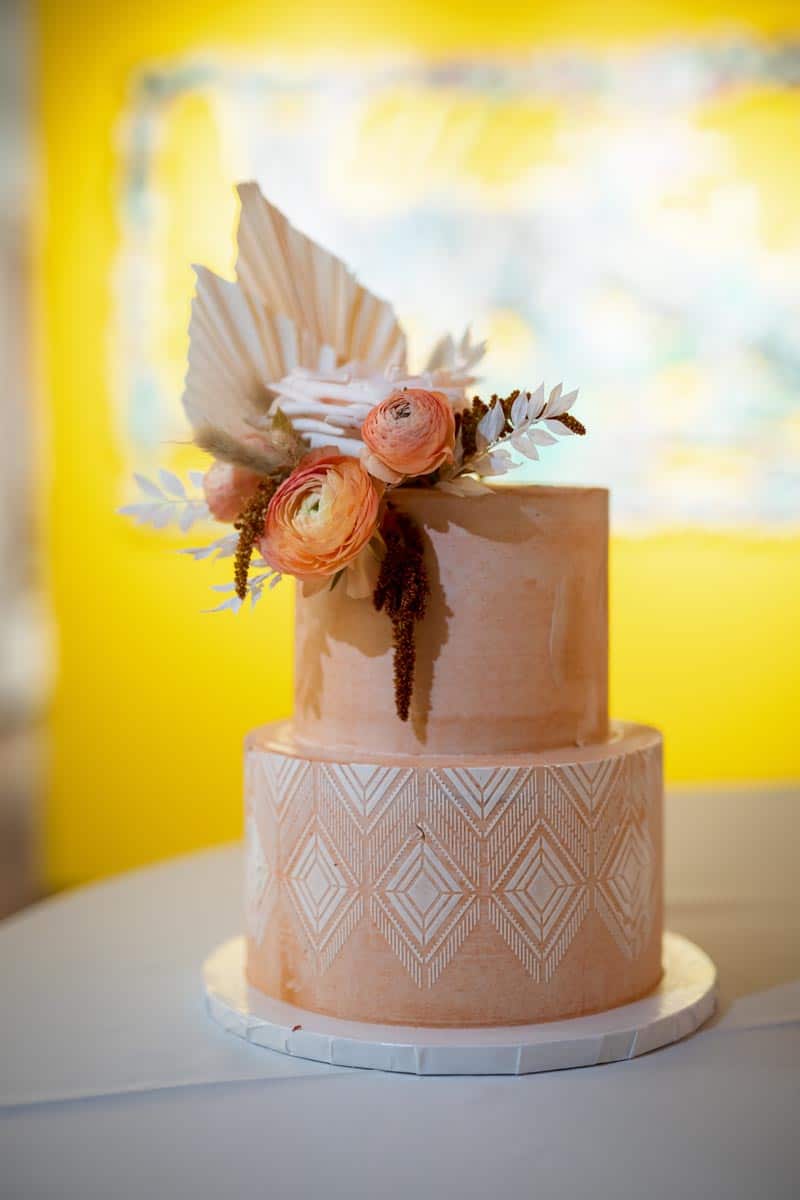 Posh and Prim took inspiration from Beverly’s Pinterest board and created the floral decor and bouquets for the wedding. They incorporated florals into the cake, photo booth and lounge as well. Their two-tier cake from Crumb and Kettle, complete with florals, looked like a piece of pottery, which is what Beverly wanted.