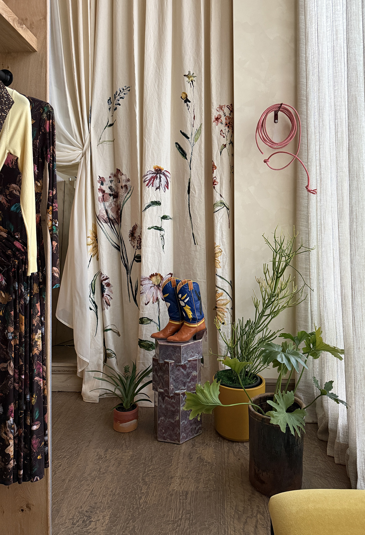 Her clothing embodies the convergence of elegance and femininity while maintaining a spirited independence and whimsy. Now, that signature aesthetic has found a home in Fort Worth, just steps from where Cowtown heritage meets contemporary art.