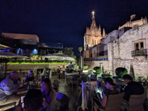 He ended up discussing his restaurant vision with friends, who encouraged him. The location he chose provided a striking view of La Parroquia de San Miguel Arcángel, the city’s iconic parish church with its “wedding cake” towers — pink in daylight but glowing a warm gold at night — that soar above the city. The majestic setting prompted the Robb Report in 2020 to name it the “No. 1 rooftop restaurant in the world,” echoed this year by Stockholm-based journalist Rikard Fredricson, whose genre specific website, The Rooftop Guide, scours the globe for superb, lofty venues.