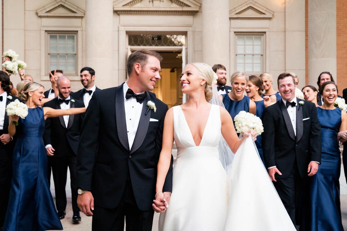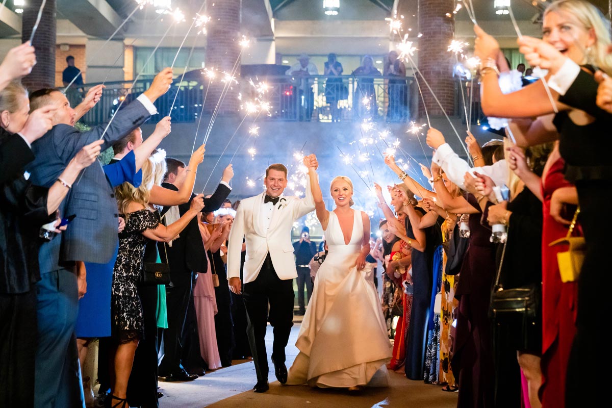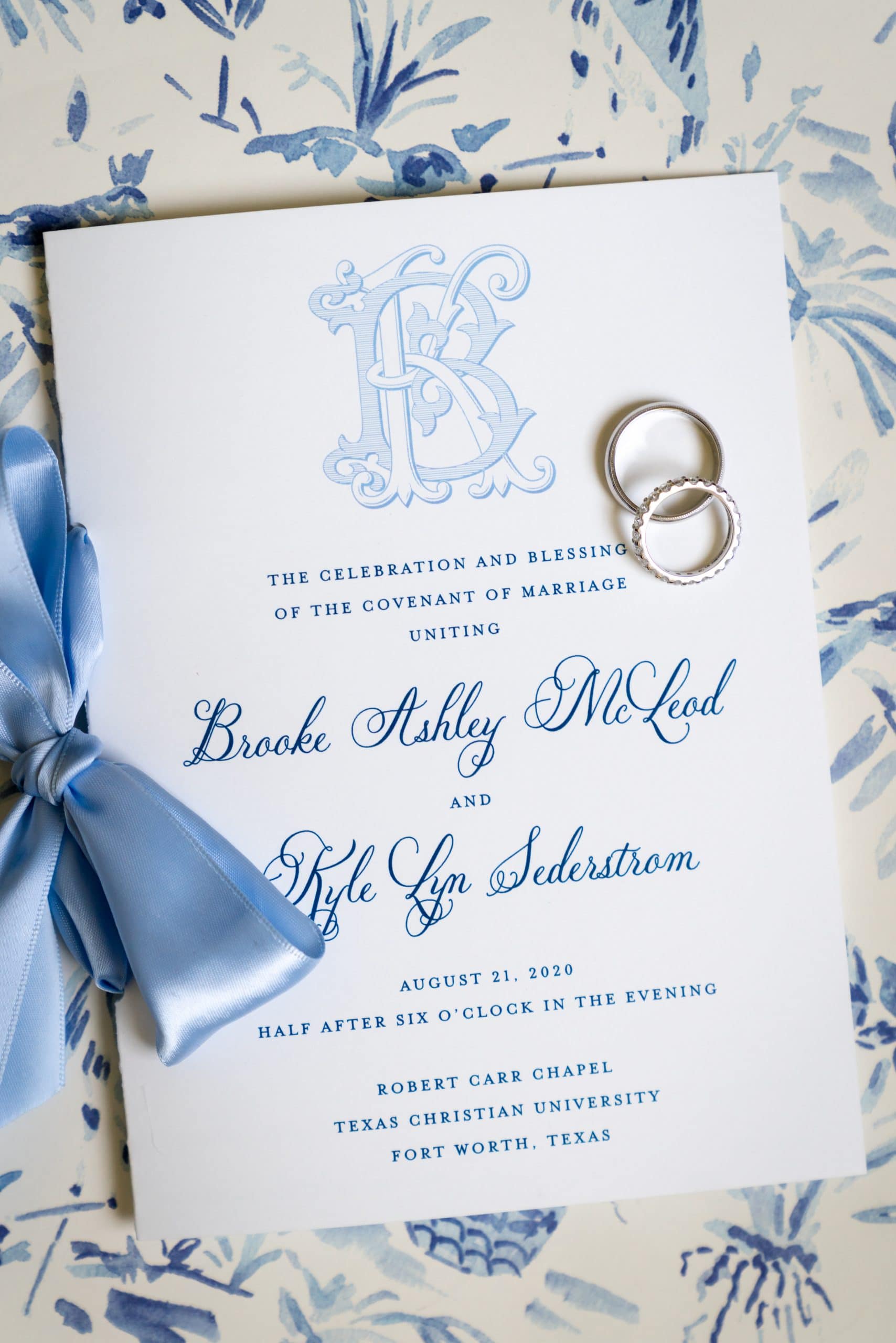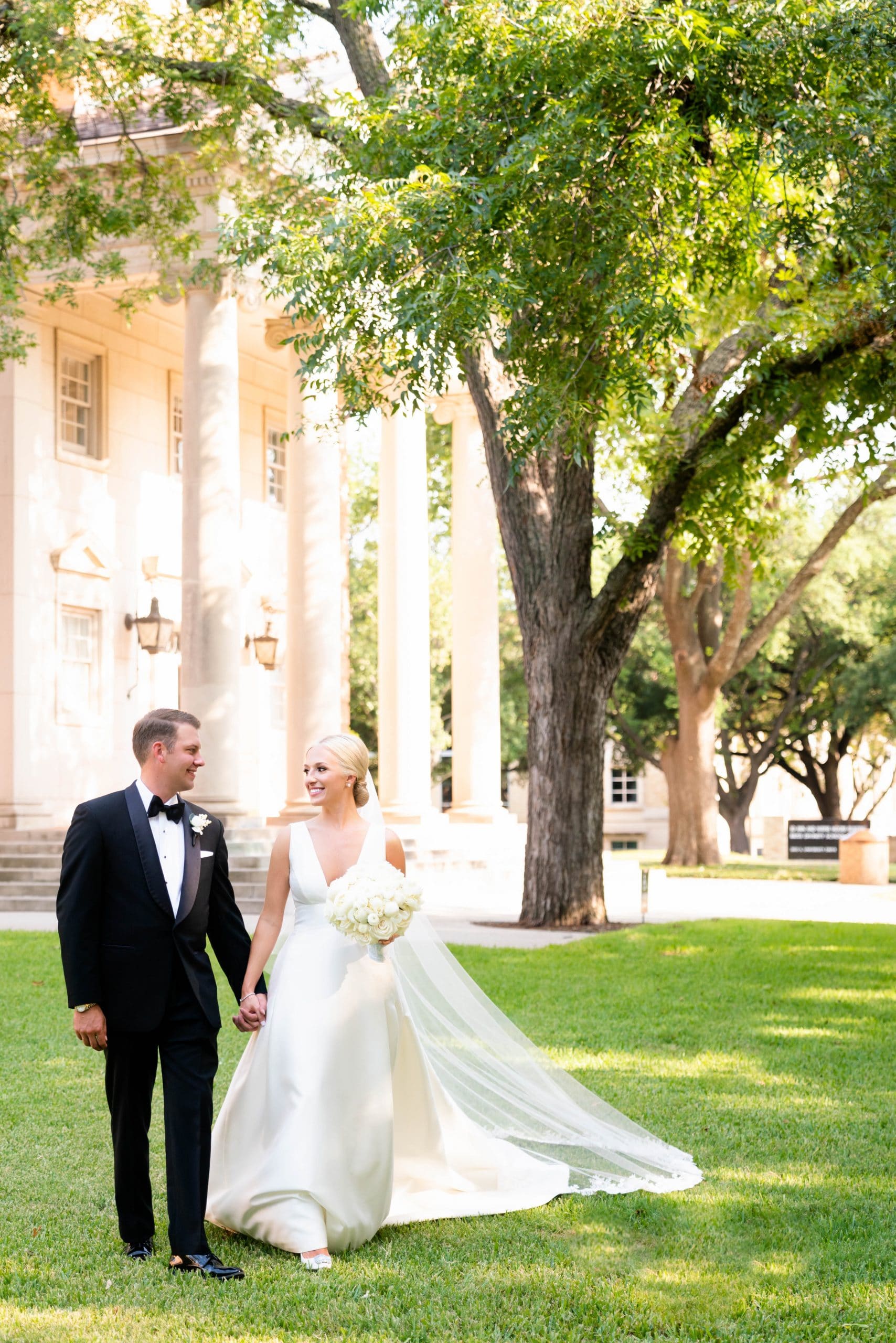 Photography: Tracy Autem Photography, Fort Worth; Ceremony venue: Robert Carr Chapel, Fort Worth; Reception venue, caterer, drink service: Rivercrest Country Club, Fort Worth; Wedding planner: Grit & Gold Event Co., Dallas; Flowers and design: Branching Out Floral & Event Design, Dallas; Furniture rentals: Perch Event Decor, Dallas; Lighting: Absolute Lighting, Dallas; Linens: LaTavola Fine Linen; Cake, groom’s cake: Crème De la Crème Cake Company, Fort Worth; Other desserts: Cowtown Cookie Co., Fort Worth; The Velvet Crumb Bakery, Fort Worth; Band: Intensity Bands, Addison; Dance floor, dance floor monogram: Center Stage Floors, Dallas; Trees/Plants: BreadnButter Special Event Plant Rental, Carrollton; Videography: Splendor Films, Dallas; Photo booth: MirMir Photo Booth; Laser duogram wood cutouts: Artifacture, Dallas; Ceremony music: Serenata Strings; Duogram: Shuler Studio; Wedding Crest: Mesh By Alex Schwenke, Houston; Other stationery: Paper Planet, Fort Worth; Balloon arch: Stellar Balloons, Fort Worth; Wedding dress, veil, accessories: Neiman Marcus Bridal Salon, Dallas; Bridesmaid dresses: Bella Bridesmaids, Dallas; Groom/groomsmen attire: Culwell & Son, University Park; Jeweler: Read’s Jewelers, Fort Worth; Hair & makeup: Maitee Miles, DFW; Transportation: Premier Transportation of Dallas and Hamilton Transportation, Arlington; Rehearsal dinner venue: The Fort Worth Club