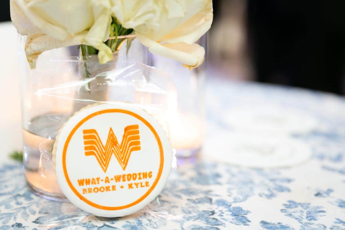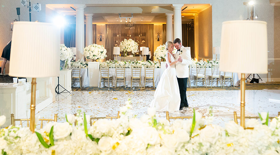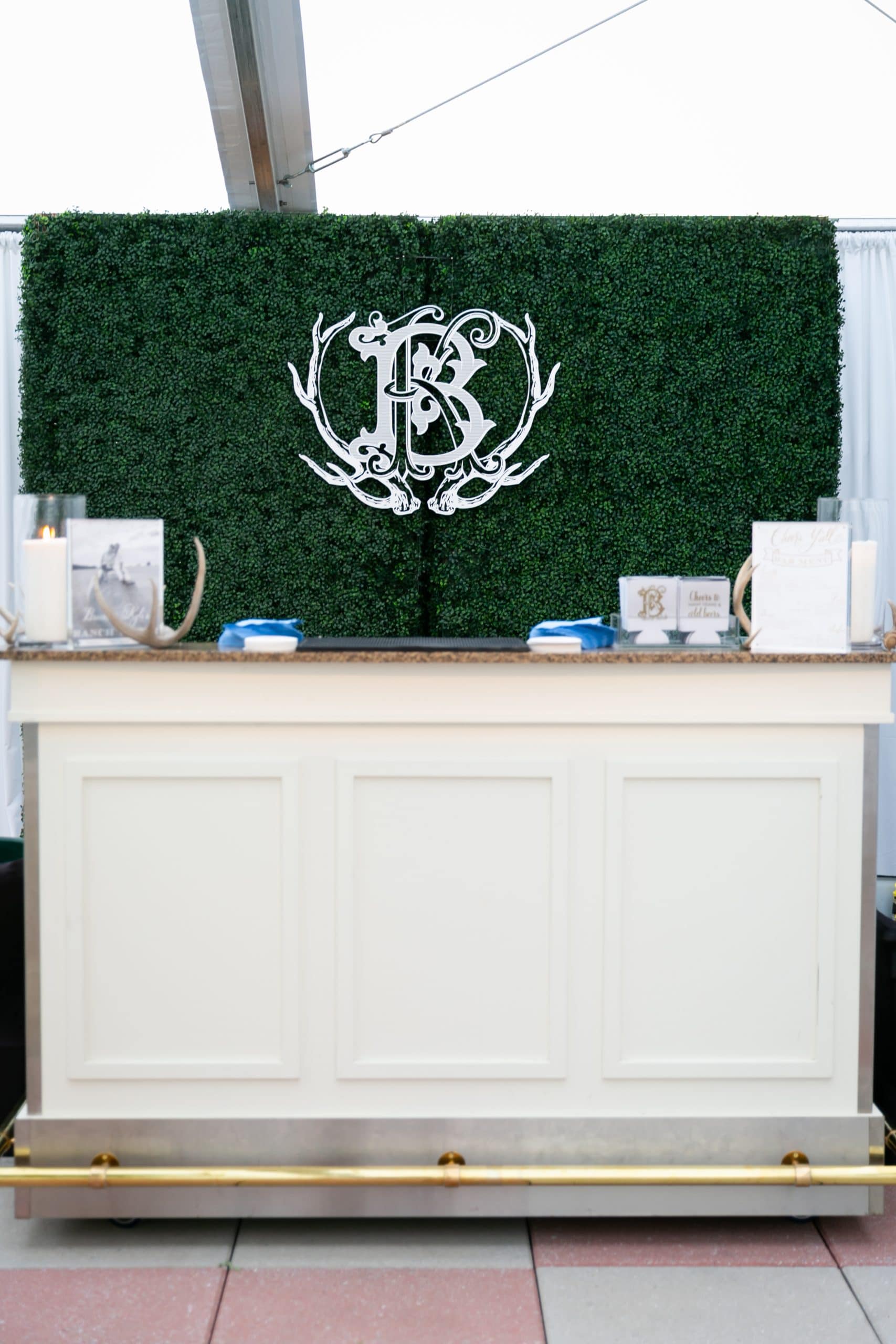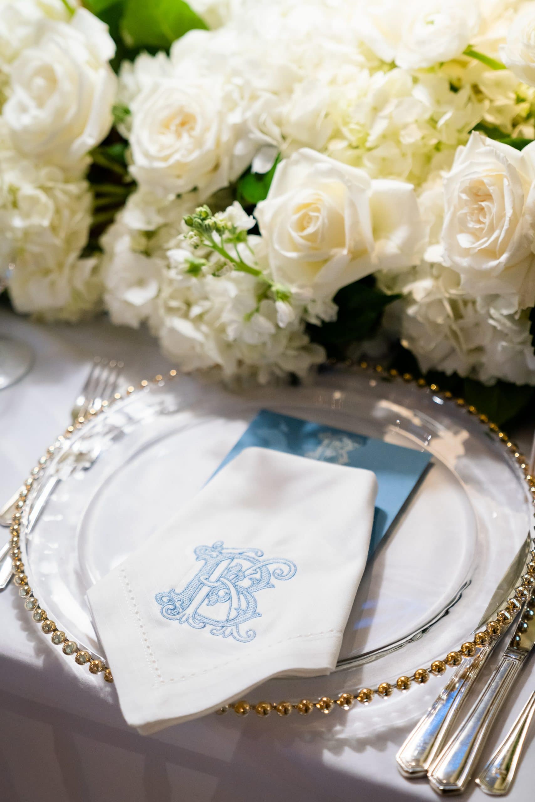 Brooke’s bouquet consisted of white peonies, ranunculus and garden roses wrapped in white silk. A custom Shuler Studio duogram was featured on the bouquet silk, and throughout the décor.