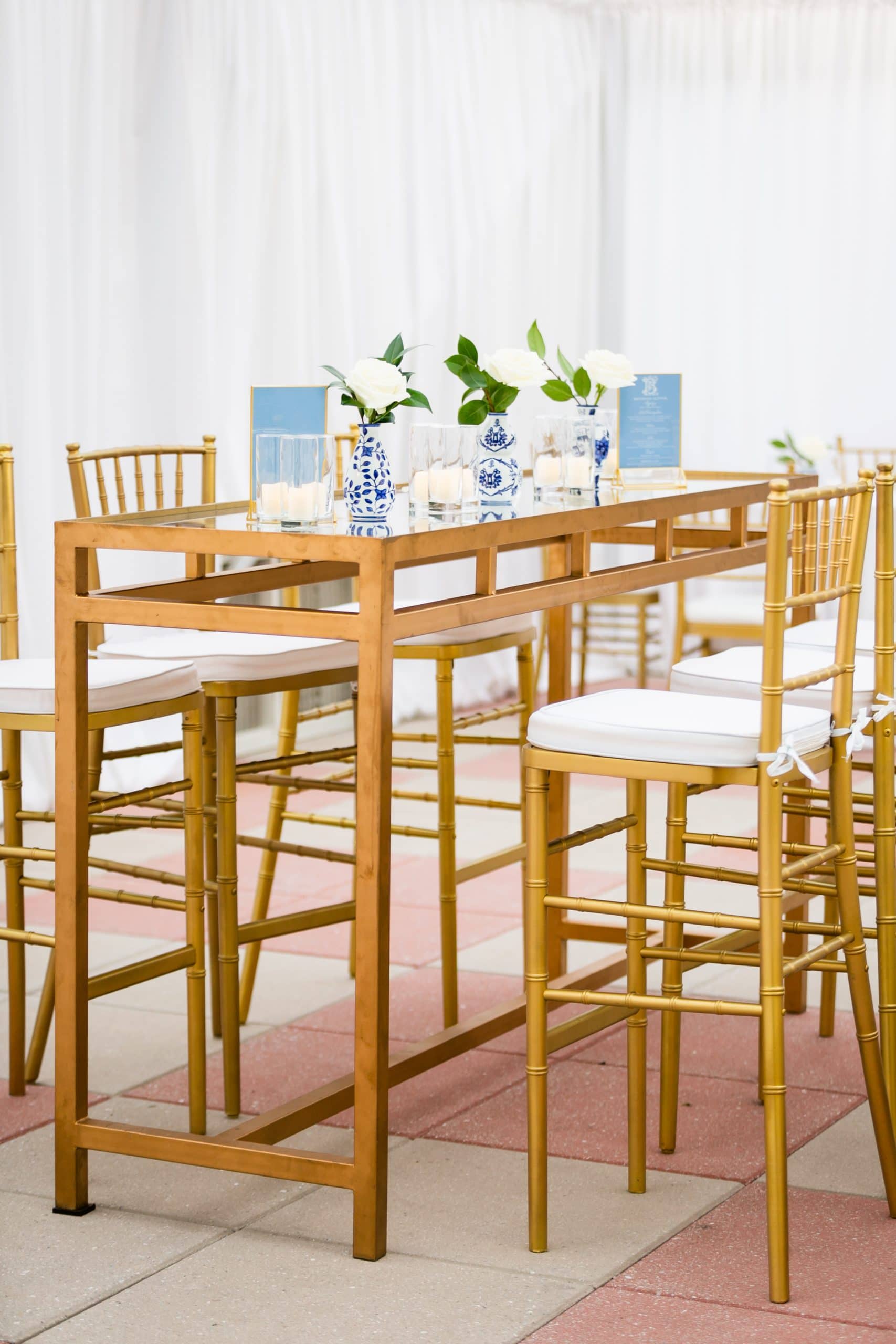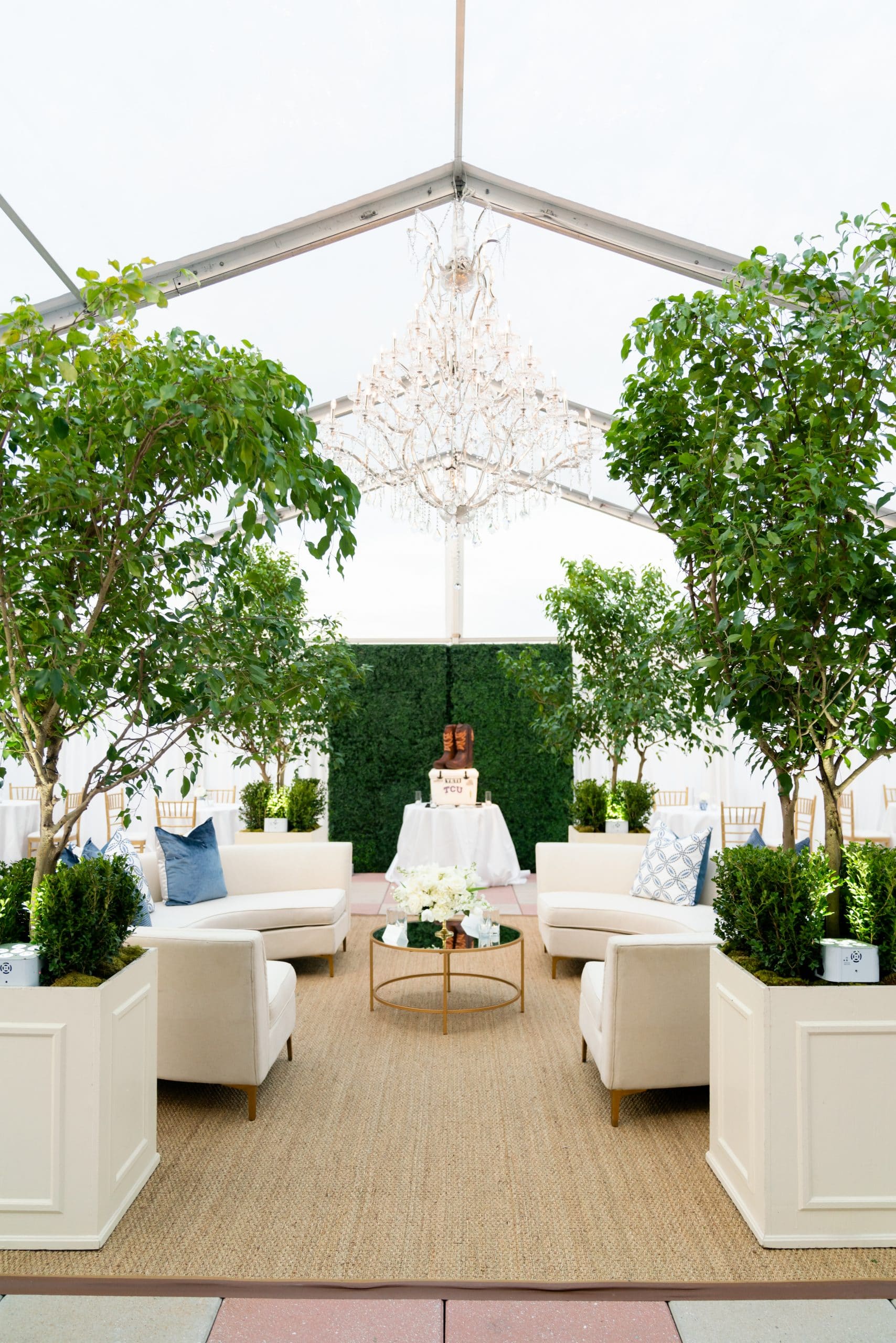 Brooke knew she wanted a classic, timeless and elegant Southern wedding. She’s obsessed with boxwoods of all shapes and sizes, white florals and ginger jars, which she incorporated into the overall wedding design. The topiary trees, chinoiserie jars and traditional Southern florals, as well as the Restoration Hardware restaurant aesthetic (complete with a giant crystal chandelier) adorned their tented lounge area.