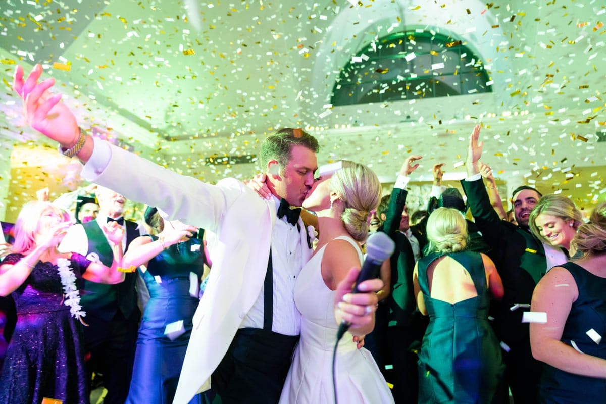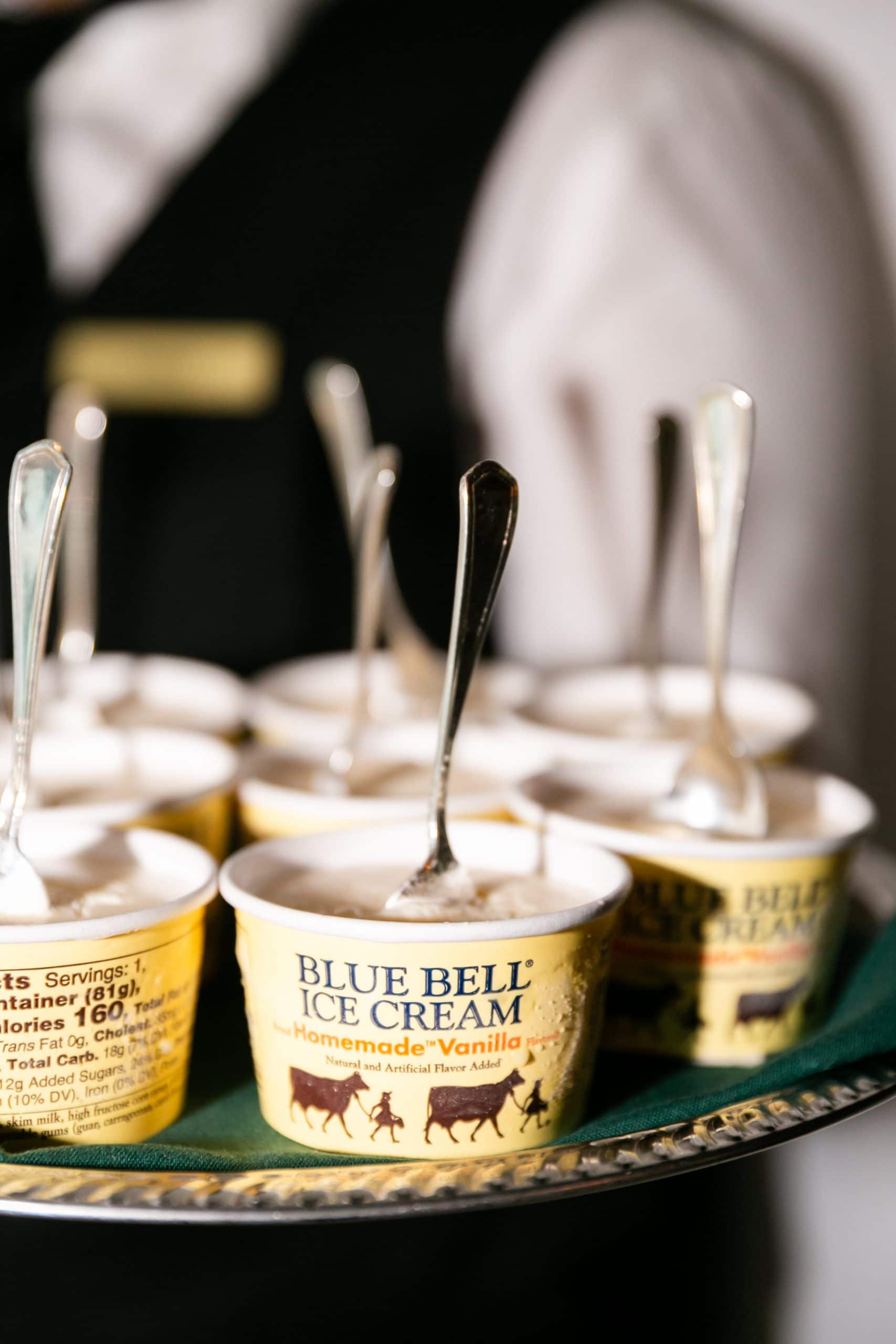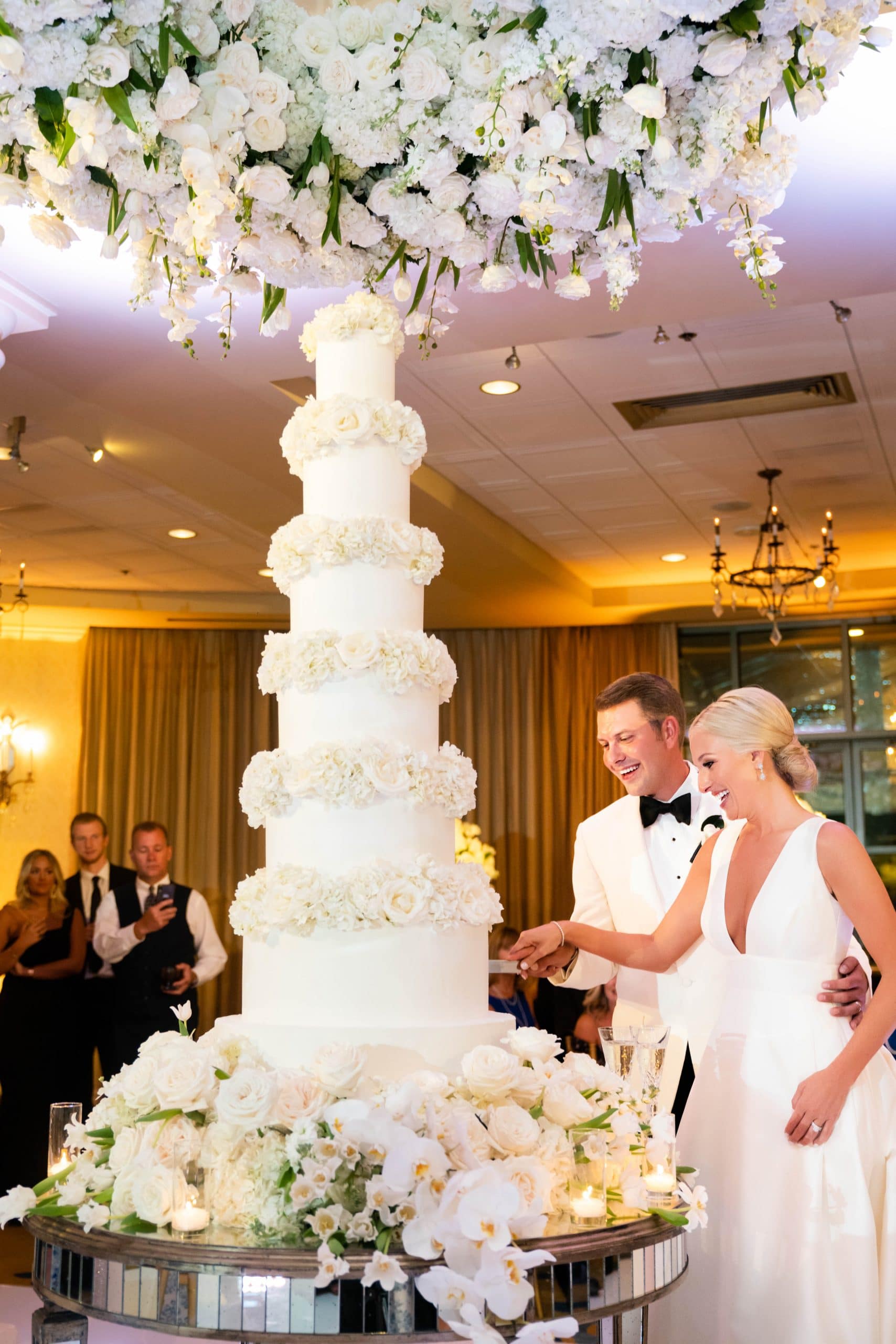 Branching Out Events created two huge, luxurious floral arrangements in gold urns that were placed on each side of the altar. Katy at Branching Out and Jamie at Crème de La Crème Cake Company created the towering 6-foot-tall cake with a 5-foot-wide floral halo that they suspended above it. The cake was displayed on a round mirrored table and placed in the center of the ballroom. The groom’s cake was shaped to look like a pair of cowboy boots on top of a Yeti cooler. Their getaway car was a white Rolls Royce Phantom with a “Just Married” sign and “No more kissing frogs” printed beneath.