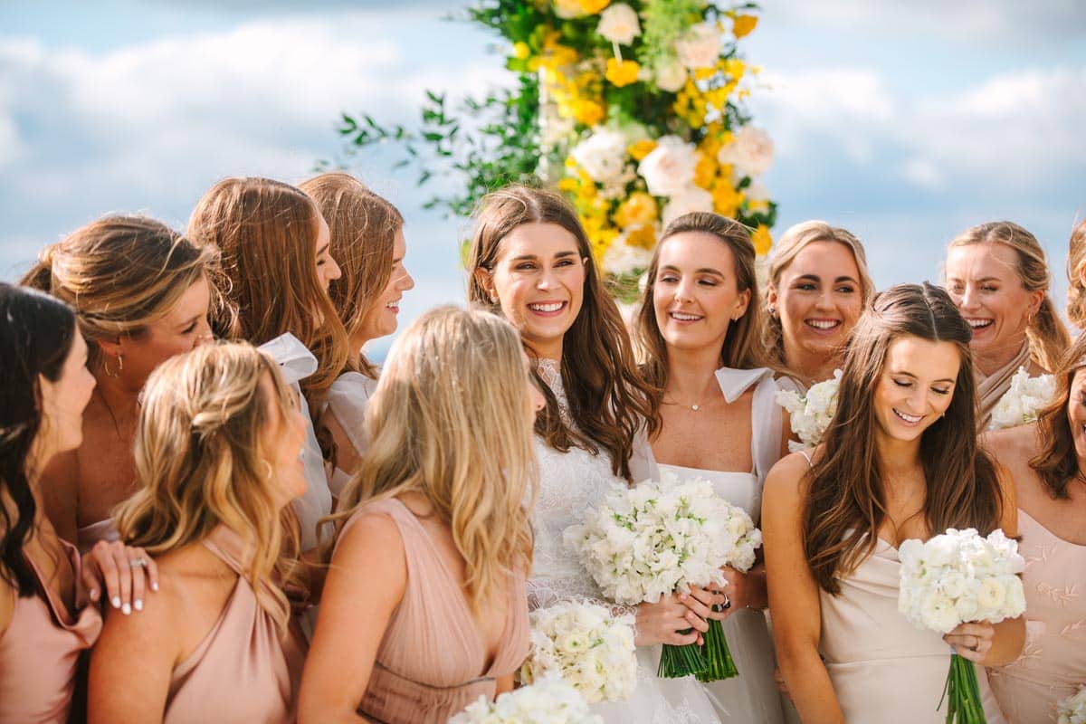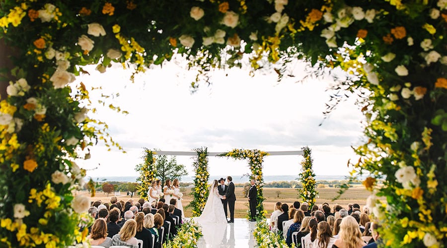 FLOWER POWER Radiant hues of yellow, green, white and blush created a stunning scene that embraced the ranch’s fall landscape. THE LOOK Cate stunned in a Monique Lhuillier gown, while her bridesmaids chose their own dresses. In true Texan style, the groomsmen sported black suits and cowboy boots.