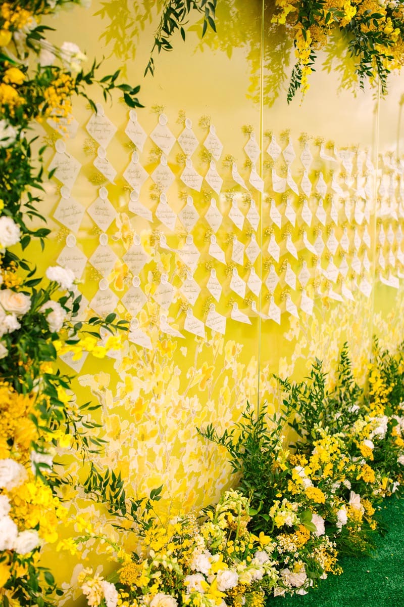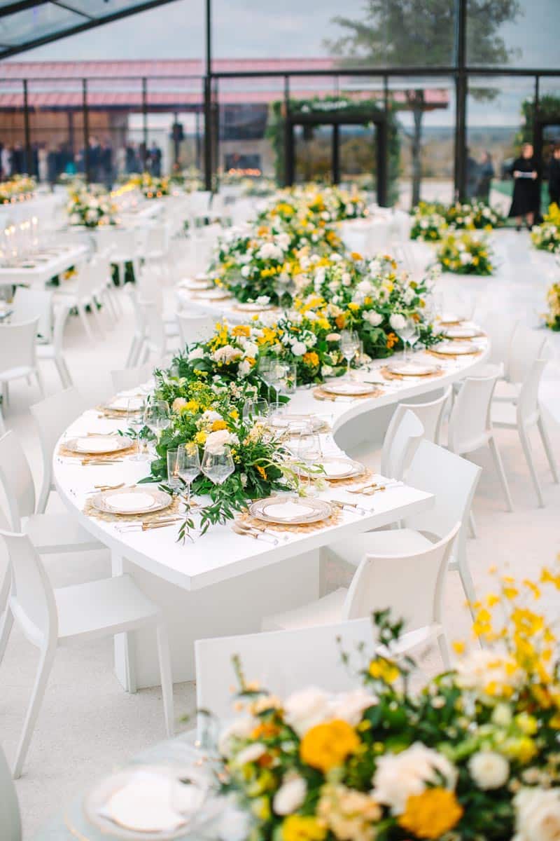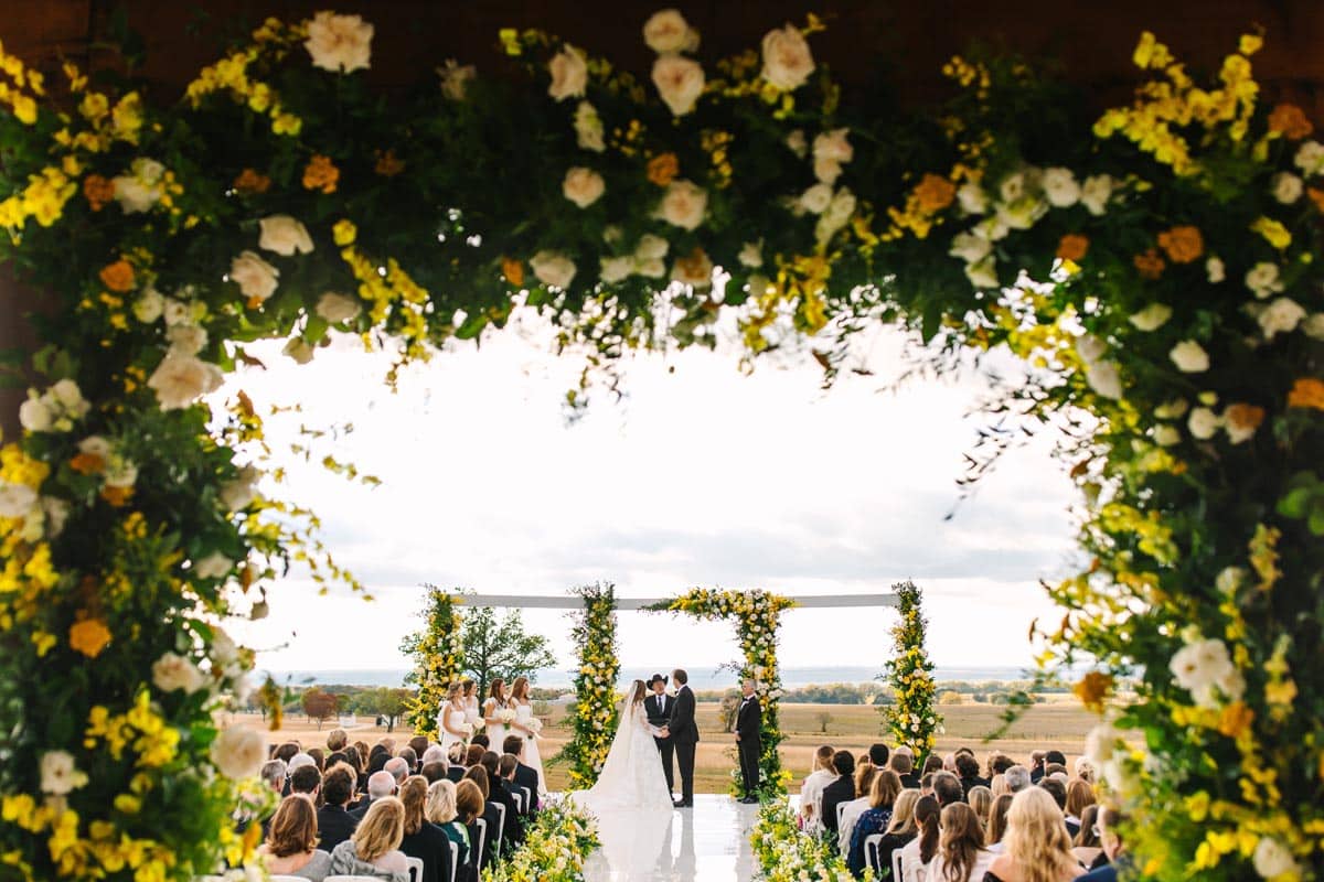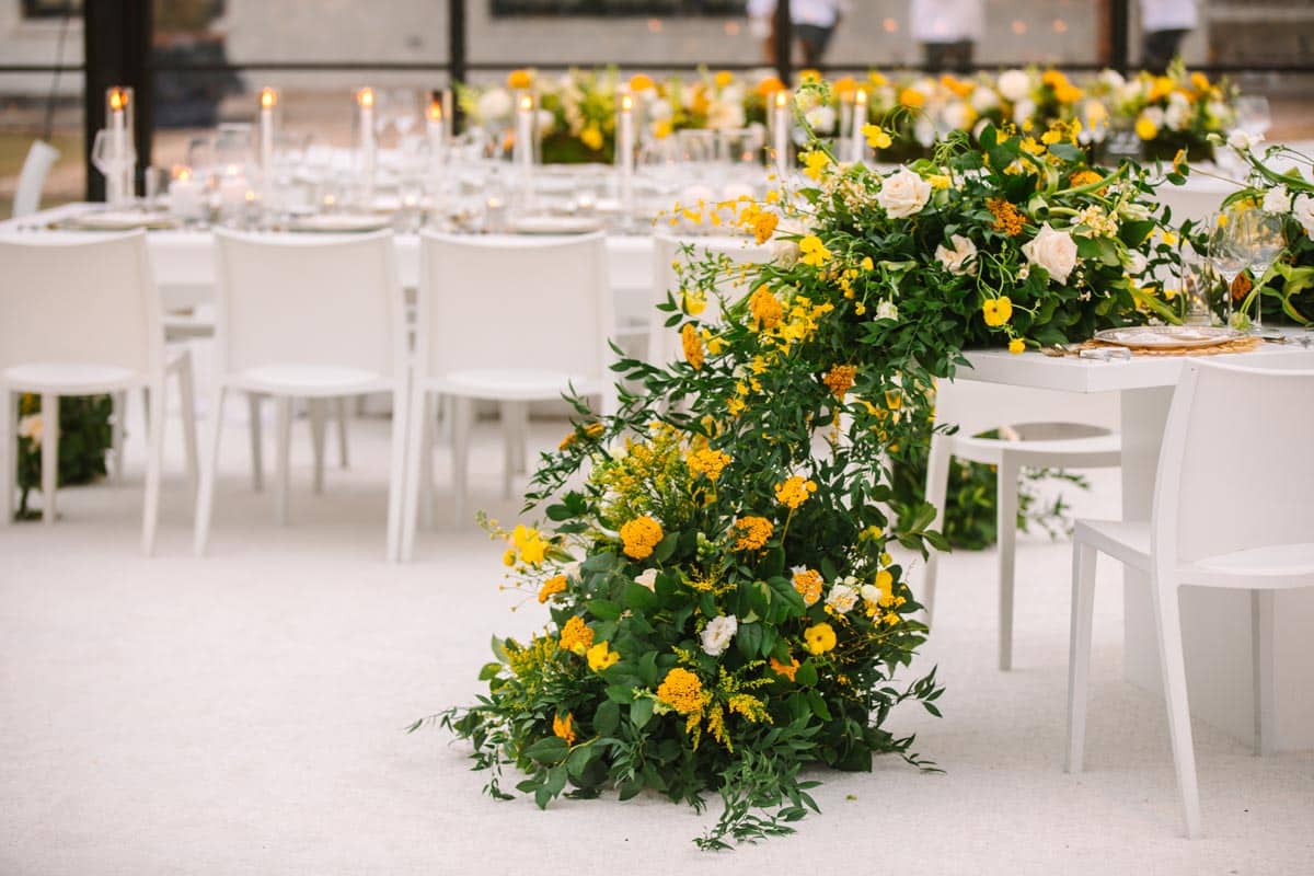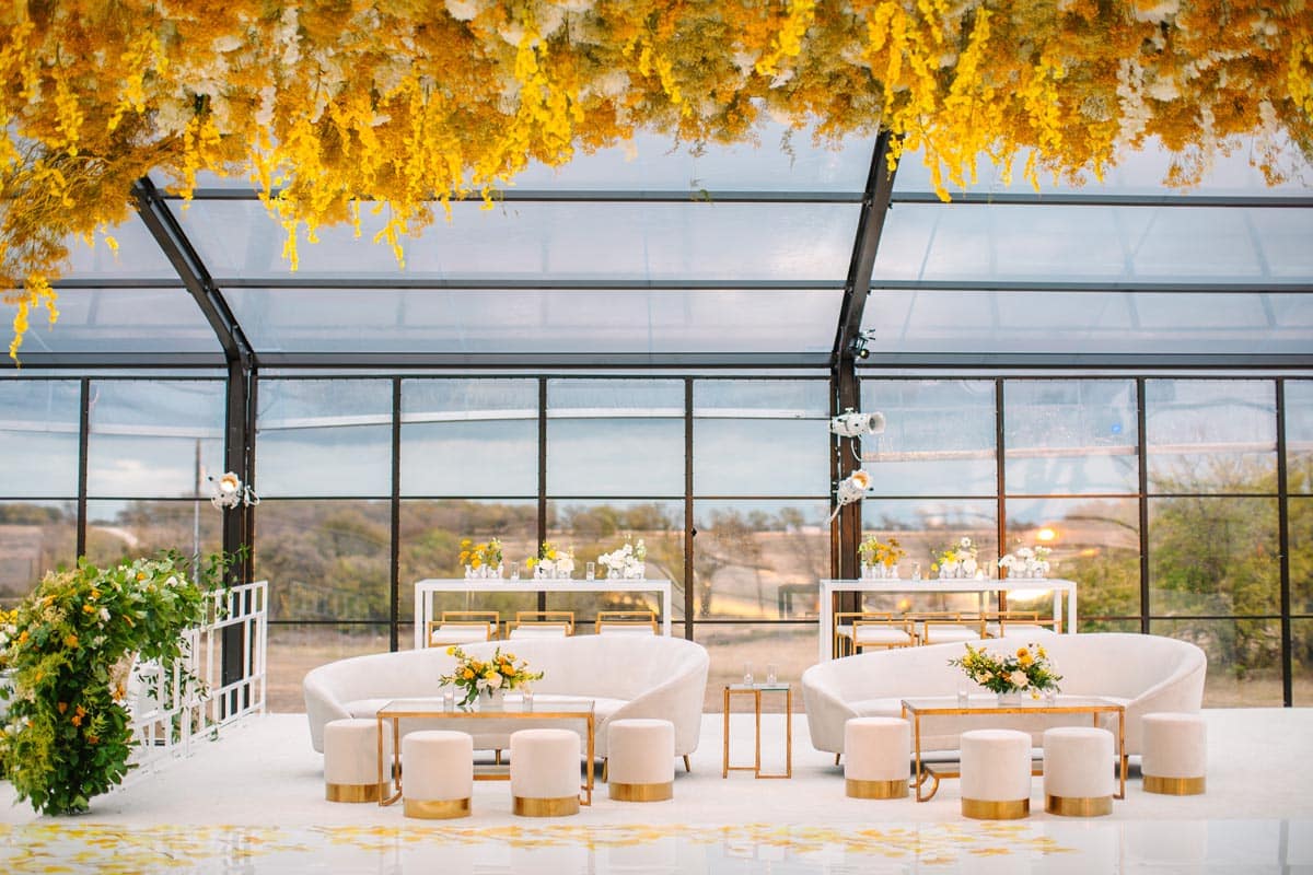 Radiant florals in hues of yellow, green, white and blush transformed the ranch into a whimsical haven. The final result was a breathtaking tapestry of flowers and intricate details, seamlessly blending the natural beauty of the ranch with the couple’s vision.