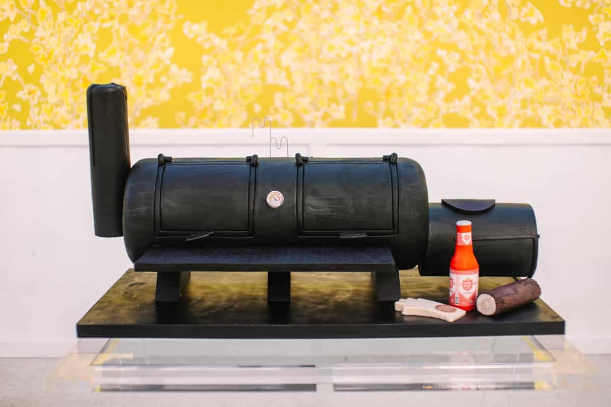 SWEET SURPRISE Inspired by Stuart’s passion for smoking meats, Fancy Cakes by Lauren crafted a cake that replicated his beloved smoker, complete with billowing smoke. “It was a surprise for Stuart and he loved it!” LET IT ROCK The couple processed out to “Sweet Child O’ Mine,” a fun and unique twist on the traditional processional. CENTER STAGE “The band, Party on the Moon, had everyone on the dance floor from right after dinner until we did our exit,” Cate says.