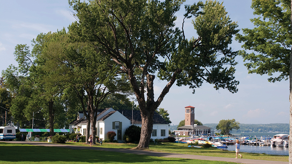 Along the west side, there are houses where patrons stay; the office of The Chautauquan Daily, the official newspaper of Chautauqua Institution, published daily during the season; and even the St. Elmo Spa, which offers spa services from manicures to massages and facials.