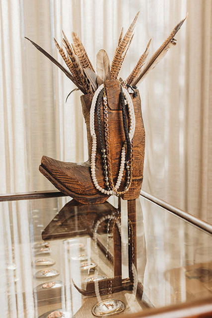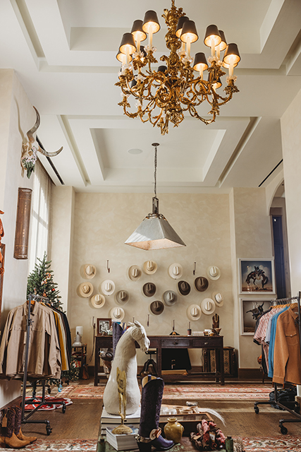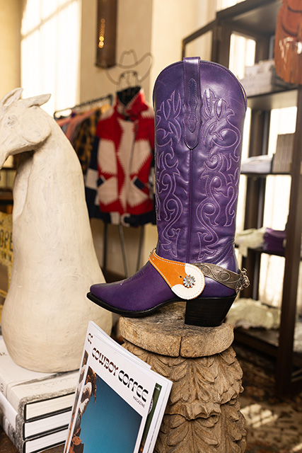 Because of this varied approach, no two items are exactly the same. Shirts might be a similar style and fit an urban Western vibe, but the fabric and color differ. The belt buckles gleaming in their case offer a variety of designs and the refurbished short brim, beaver felt hats on the wall above each carry a unique back story.