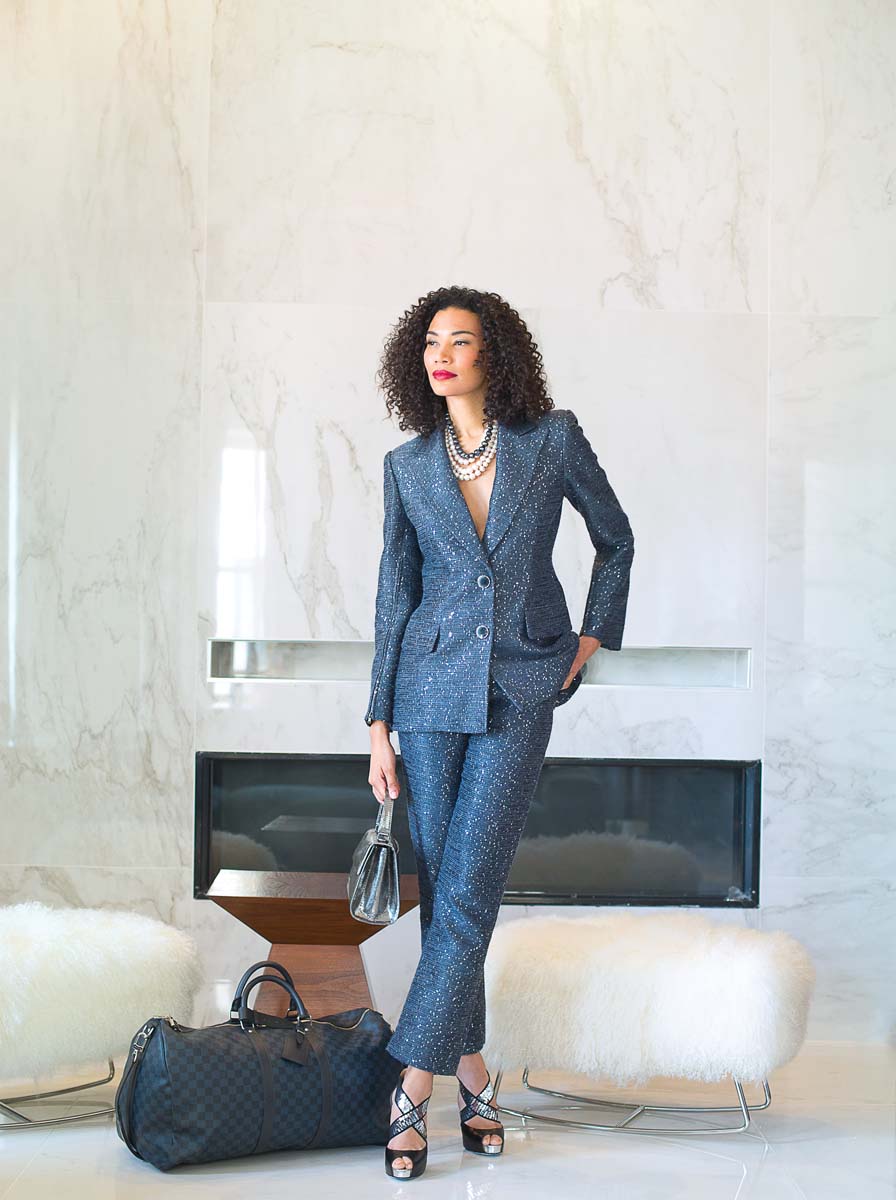 This stylish tailored pantsuit in a gunmetal gray from Burnett New York’s fall-winter collection offers hints of sparkle. Unusual touches such as zippers on the sleeves — roll them up for a more nightclub look. We love the subtle glam joined with the wearability of separates. Toss the jacket over jeans; wear the trousers with a tailored white blouse. Contact Burnett New York for pricing, burnettnewyork.com. Neiman Marcus Fort Worth is hosting an October trunk show for Burnett New York; see details on Page 28. For an evening out, we’ve paired the suit with a pair of Girl With A Pearl Bam Bam necklaces ($255 for the white; $114 for the black), both from Lawrence’s Fort Worth. FYI, pearls are having (another) moment this fall. We think they’re timeless for all seasons. A Nancy Gonzalez top-handle handbag in metallic lizard, $2,950, and Xiletta Disco Ball platform sandals from Christian Louboutin, $945, add more shimmer. Both from Neiman Marcus Fort Worth. Everything packs easily in a Louis Vuitton Keepall Bandouliére 55 duffel bag in Damier Graphite canvas, $1,840.