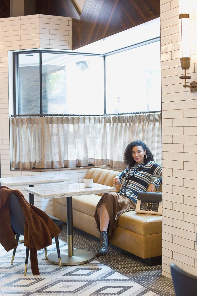 Last year’s photo shoot for our fall style issue took us to Rancho Loma in Coleman, Texas. We took advantage of the scenic countryside surrounding the modern boutique inn and the historic farmhouse that make up the unique getaway not far from Abilene. This year, we opted for a staycation at The Sinclair, a new hotel in Fort Worth’s Sundance Square. And while we didn’t have the opportunity to spend the night — work continues to get the property open in November — we were able to use the 17th-floor rooftop deck, the stylish guest rooms and inviting public areas as backdrops for our “City Chic” fashions. Surrounded by construction workers, building inspectors and hotel employees, we marveled at the transformation-in-progress of the former Sinclair office building into an art deco-inspired hotel filled with amazing tile work, covetable Italian-made furniture in the lobby and, yes, evocative reminders of its historic past. We’re excited to see the completely finished product, enjoy dinner at Wicked Butcher in the basement or oysters in the lobby lounge, have a cocktail on the rooftop and maybe even check in for real. The Sinclair, Autograph Collection, Sundance Square, 512 Main St., Fort Worth, thesinclairhotel.com.