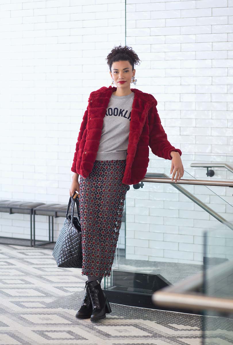 There’s an abundance of plush outerwear this season in solids and prints, in all colors and styles. From faux shearling to faux fur, they’re as functional as they are fun, and they will keep you warm. Apparis’ Goldie short jacket in ruby red snaps up and comes with oversized hood, $225, You Are Here Fort Worth. We’ve paired it with a Brooklyn sweatshirt, $49.50, J.Crew, and Burnett New York’s incredibly detailed sheer woven skirt with metal accents. Pricing on request at burnettnewyork.com. Kori Green Extra Extra gray-petal pearl earrings, $220, You Are Here Fort Worth. MZ Wallace quilted Metro tote, $235, Malouf’s Southlake. Coach reimagines hiking boots for city walking with Hedy side-zip booties with lug soles, $250, Coach Southlake.