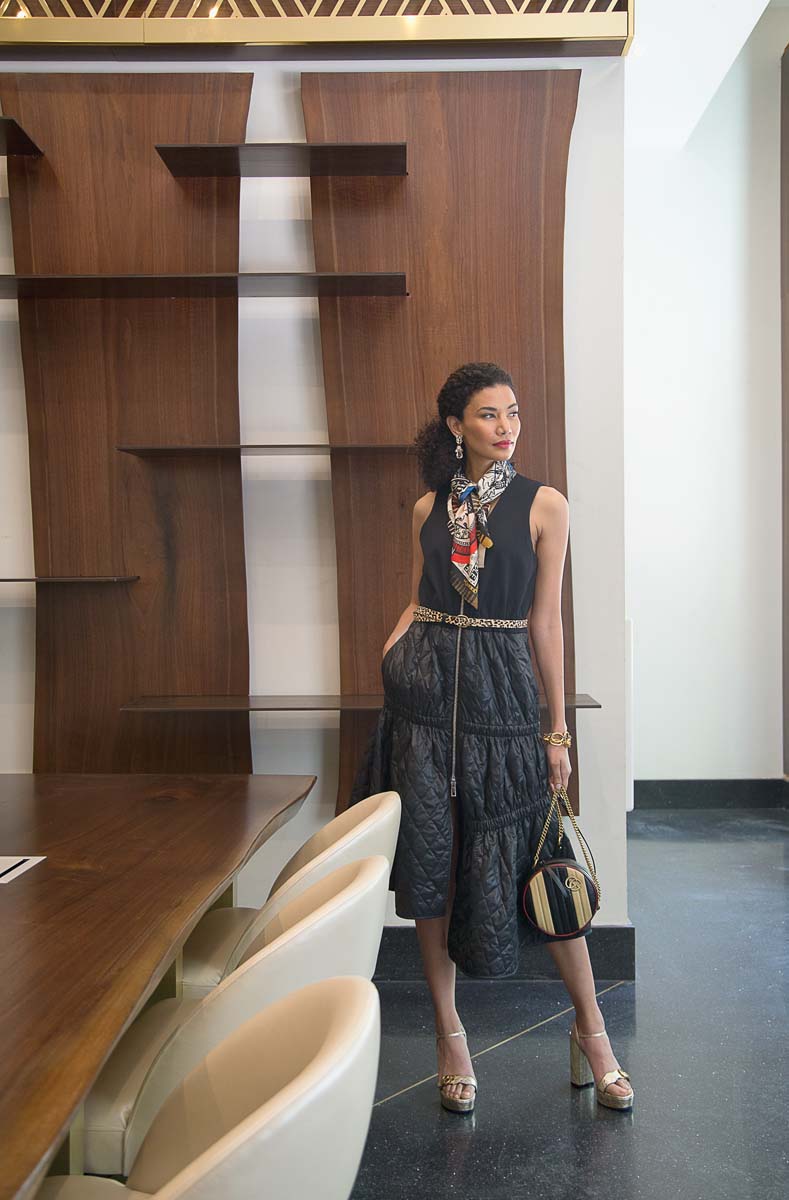 The puffer takes on a new look in Tibi’s asymmetric zip dress with its soft quilted skirt, $995, You Are Here Fort Worth. It’s lightweight and perfect to wear over pants for an even more fashion-forward look. We dressed it up a bit by adding our own belt in animal print plus a printed silk scarf from Scotch & Soda, $65, Malouf’s Southlake. Gucci Marmont metallic platform sandals, $950, Neiman Marcus Fort Worth. Crystal drop earrings, $33, and Julie Vos Soho link bracelets, $295 each, Lawrence’s Fort Worth. Gucci Marmont Mini Camera bag, $1,500, Neiman Marcus Fort Worth.