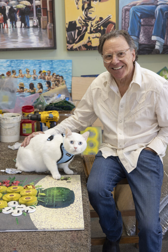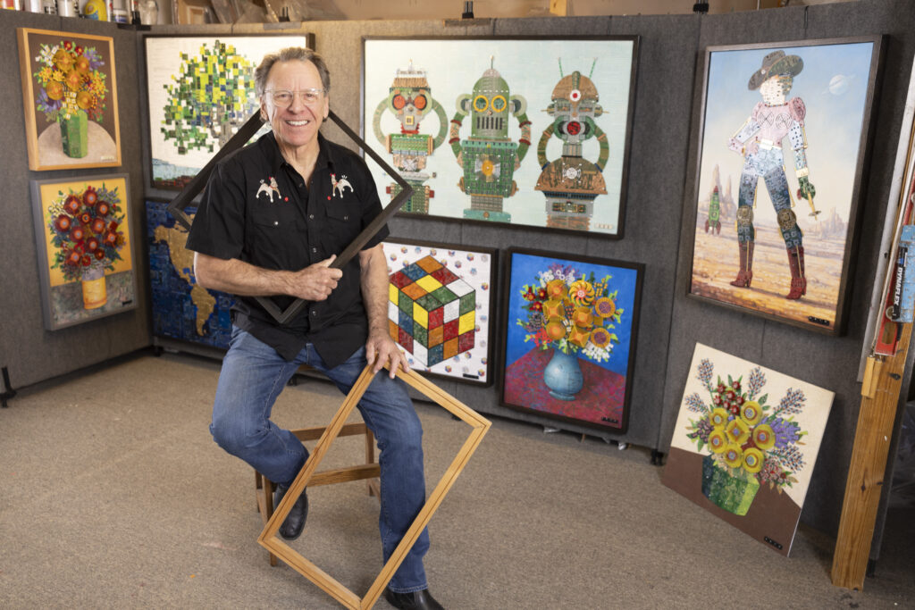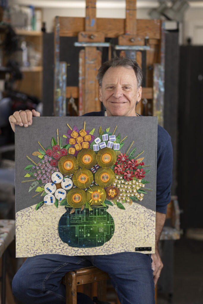 But in one of Arth’s most popular and long-running series, he uses circuit board pieces and other tech equipment, found objects, collage and paint to create images of everything from cityscapes to people, movie characters, animals and still life. The 12th verson of his “She Bot” circuit board series hangs in Arth’s studio and is ready for Art in the Square. Arth’s “She Bot’’ muse?