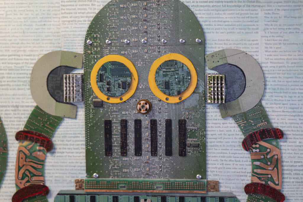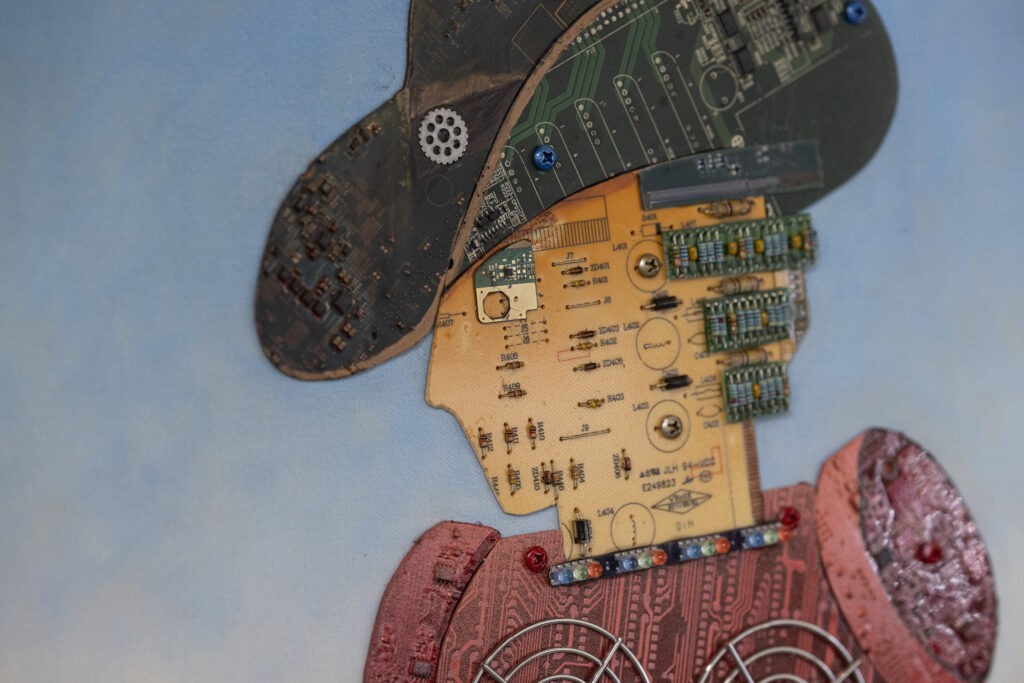 Gregory Arth uses glue and screws to make his circuit board artwork series. Many of Arth’s circuit board pieces are of still lifes, robots, and cityscapes.