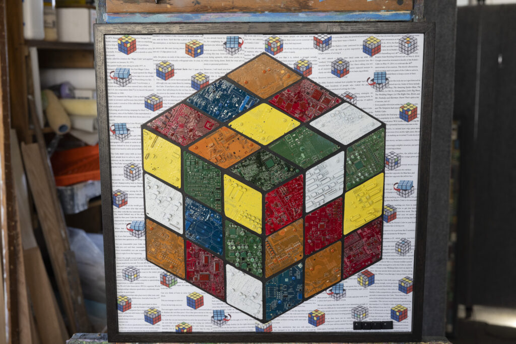 His first circuit board piece was called “Over Saturation,” a representation of New York City. He lit some of the earlier versions of his circuit board pieces from the back of the Plexiglas he mounted the pieces on. “But then I got off that because they were so complicated,” he says.