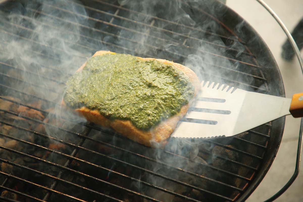 Check on your fire. Make sure the grill is nice and hot so you can get a nice char on the bottom. You’ll be topping the fish with the pesto, so you won’t be flipping it. A nice high heat, then slowed down slow and smoky will result in a delicious charred bottom, perfectly moist center and buttery pesto top.