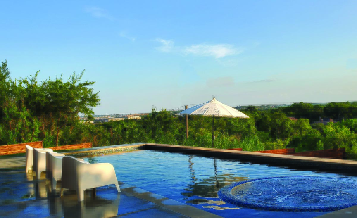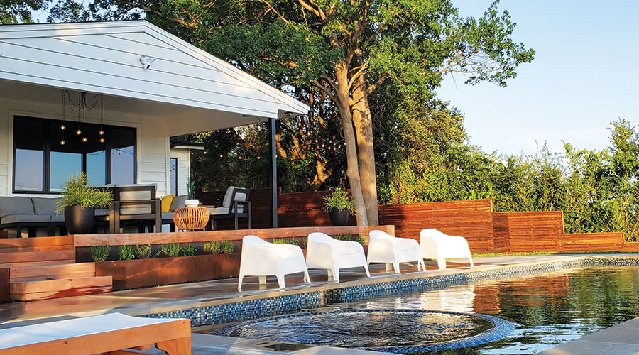 The couple presented their ideas to Puryear Custom Pools, which ultimately used the slope of the yard to give the design the look of an infinity edge without the expense of creating one. Work started in November 2020 and, fortunately, there were no setbacks from February’s deep freeze. By mid-May, the pool was fully functional.