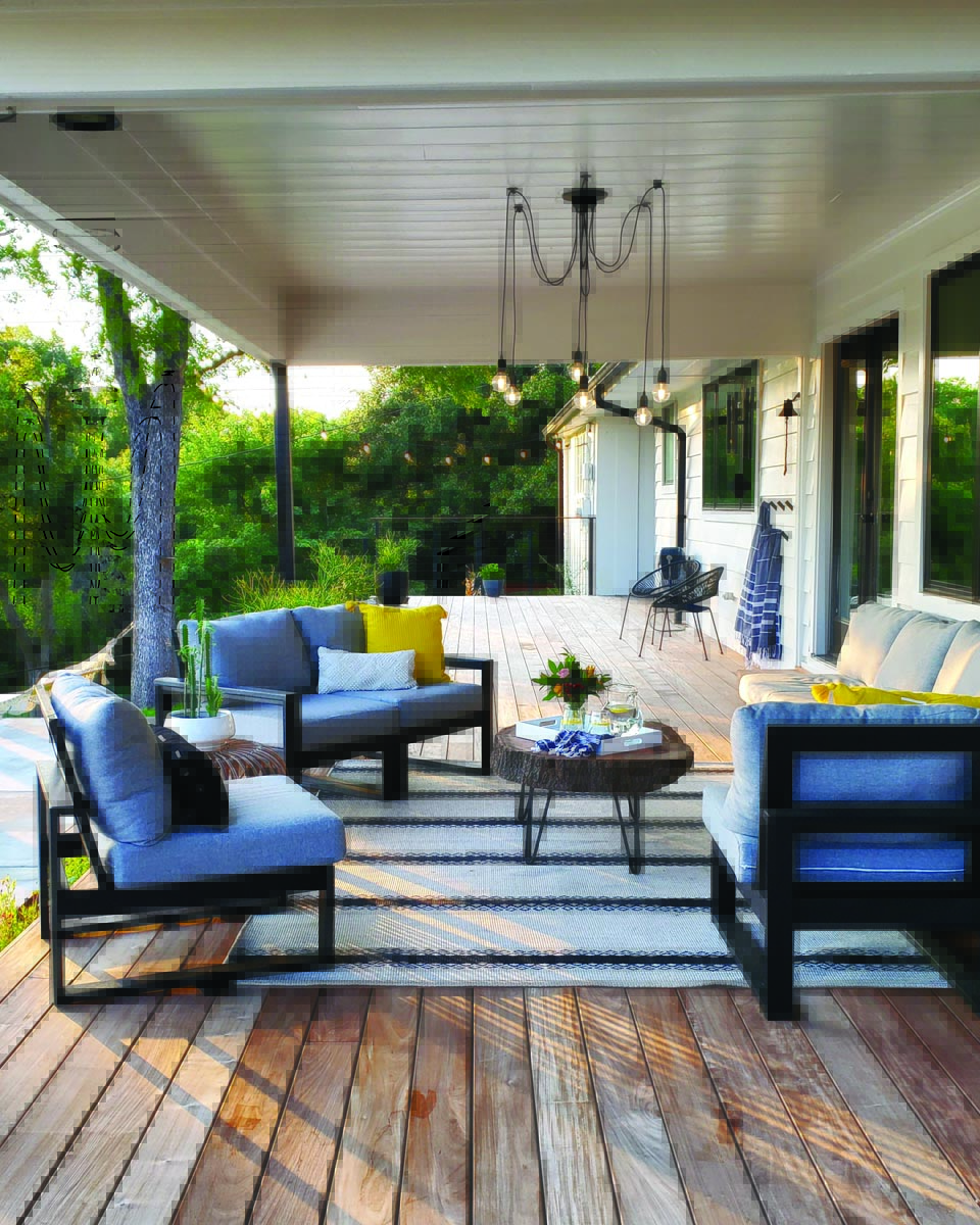 Three sets of stairs lead to the pool deck, which runs 12 feet deep and 60 feet wide (the width of the home). To ensure that all weathers well, builder Mark Hickman sourced ipe, a Brazilian hardwood. Hickman also removed three walls of the screened-in porch and added new metal support columns to its roof. This created a protected area for Chelsie to create an outdoor living room. (Joe used a big slice of the removed red oak to make a cocktail table.) The deck wraps around the house, and Chelsie set up an al fresco dining “room” that takes advantage of the backyard view.