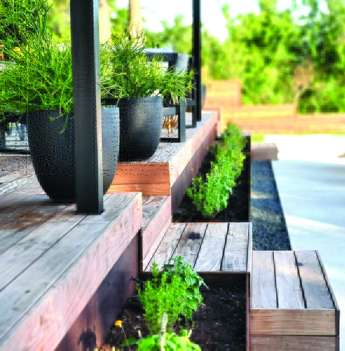 Metal planters filled with sun-friendly perennials line the deck and back side of the pool. A new wood fence stair-steps its way down the sloped lot. A bohemian-inspired hammock swings between two small trees off to one side of the pool.