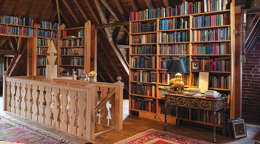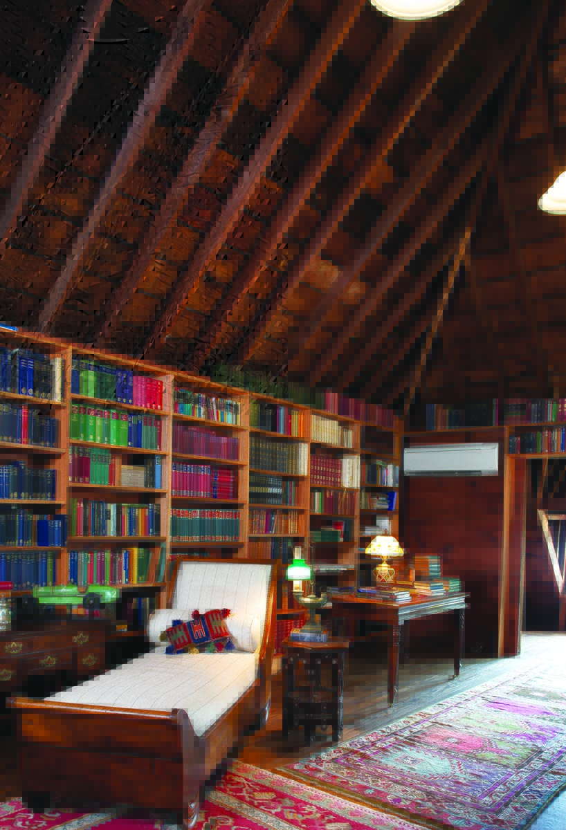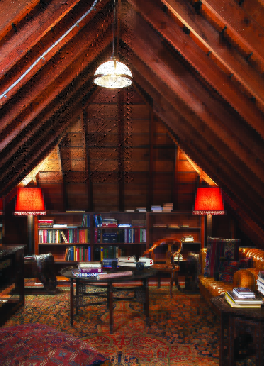 The aroma of leather and lumber is intoxicating. There’s nary a bestseller in sight; instead, custom-built shelves in this attic library with 20-foot ceilings hold first editions of The Arabian Nights and beautifully bound books on Asian religion. Everything is arranged by subject matter.