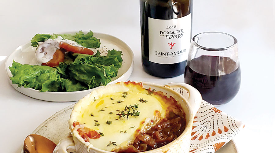 Beaujolais and French onion soup are a classic combination. Like many gamay wines, this Saint-Amour wine is fruity and refreshing. The bright acid that offsets the delicious umami of the soup resets the palate after each sip, but it won’t overpower the subtle sweetness and nuttiness in the caramelized onions and melted Gruyere. $21, Put a Cork In It, putacorkinitwine.com