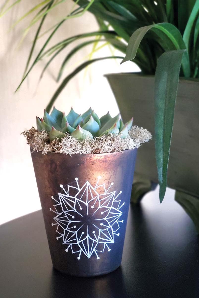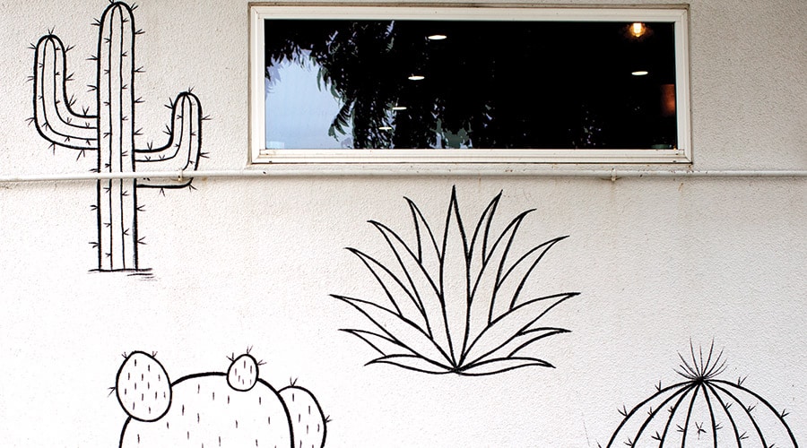 Today, Ayala continues to paint mandalas, sleuthing out interesting and unusual maps. Her distinctive work can be seen at local businesses, such as the cactus silhouettes at Taco Heads on Montgomery Street and at The Greenhouse 817 production warehouse on the southside of Fort Worth, owned by Deryk Poynor, her sister-in-law. When Sarah’s brother, Joseph, opened Panther City Tattoo on South Main Street, he looked to his sister to paint the distinctive black cat mural at his shop.