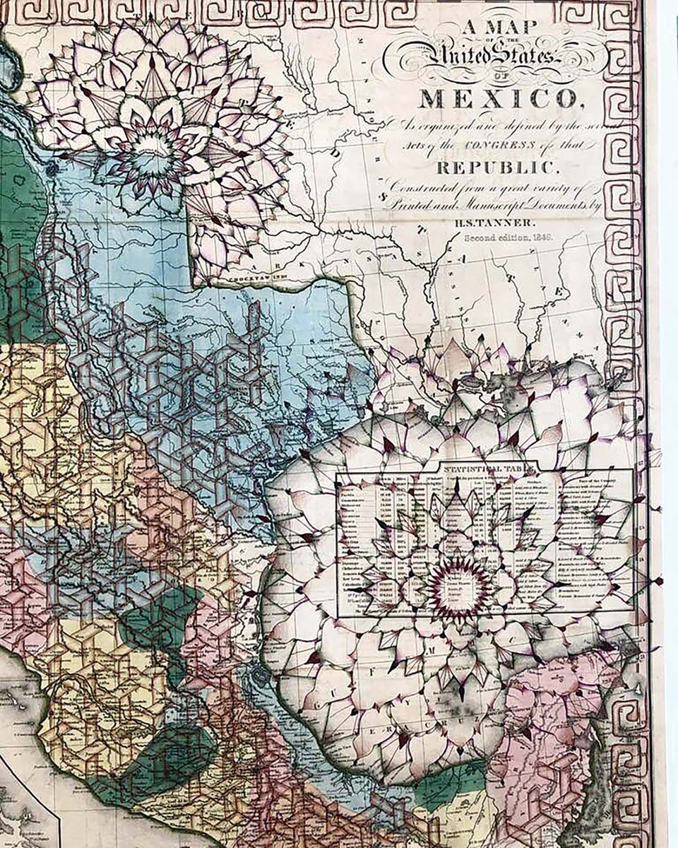 The discovery of some old National Geographic maps led to the artist’s experimentation with graphic optical designs using latitude and longitude lines, but she was still restless. A few years ago, she packed up all her work, including the maps, and moved to Boulder, Colorado, for a baking job. While there, she got a long-distance commission from Bill Bostelmann, owner of Flowers on the Square. “He told me my work was ‘everything,’“ Sarah says with a smile. “It did help me pay my rent.”