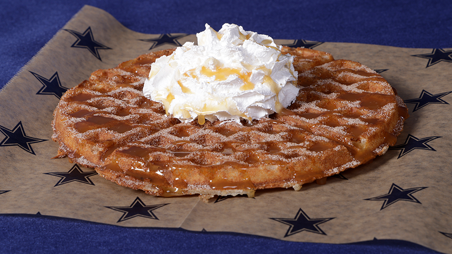 The Dallas Cowboys’ new churro waffle is tossed with cinnamon and sugar, drizzled with caramel sauce and finished with a dollop of whipped cream.