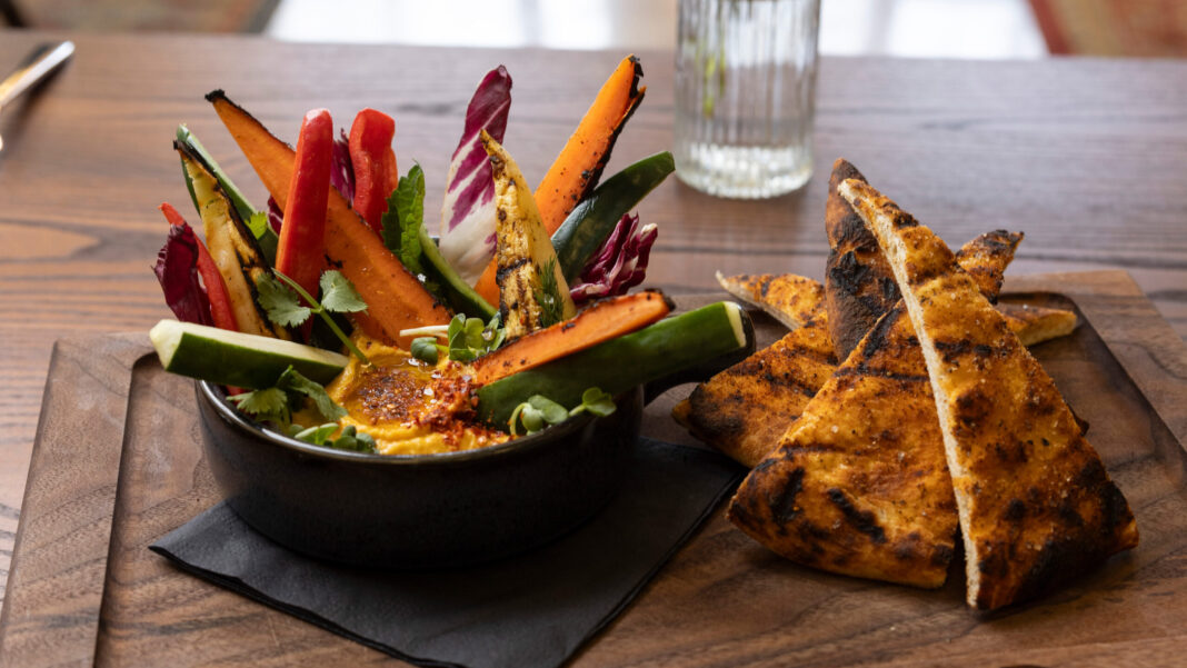 Of his Ginger-Carrot Hummus + Garden Vegetables, which he added to the menu in January, “the veggies are really what we’ve got in season. It’s a great snack to start your dinner.”