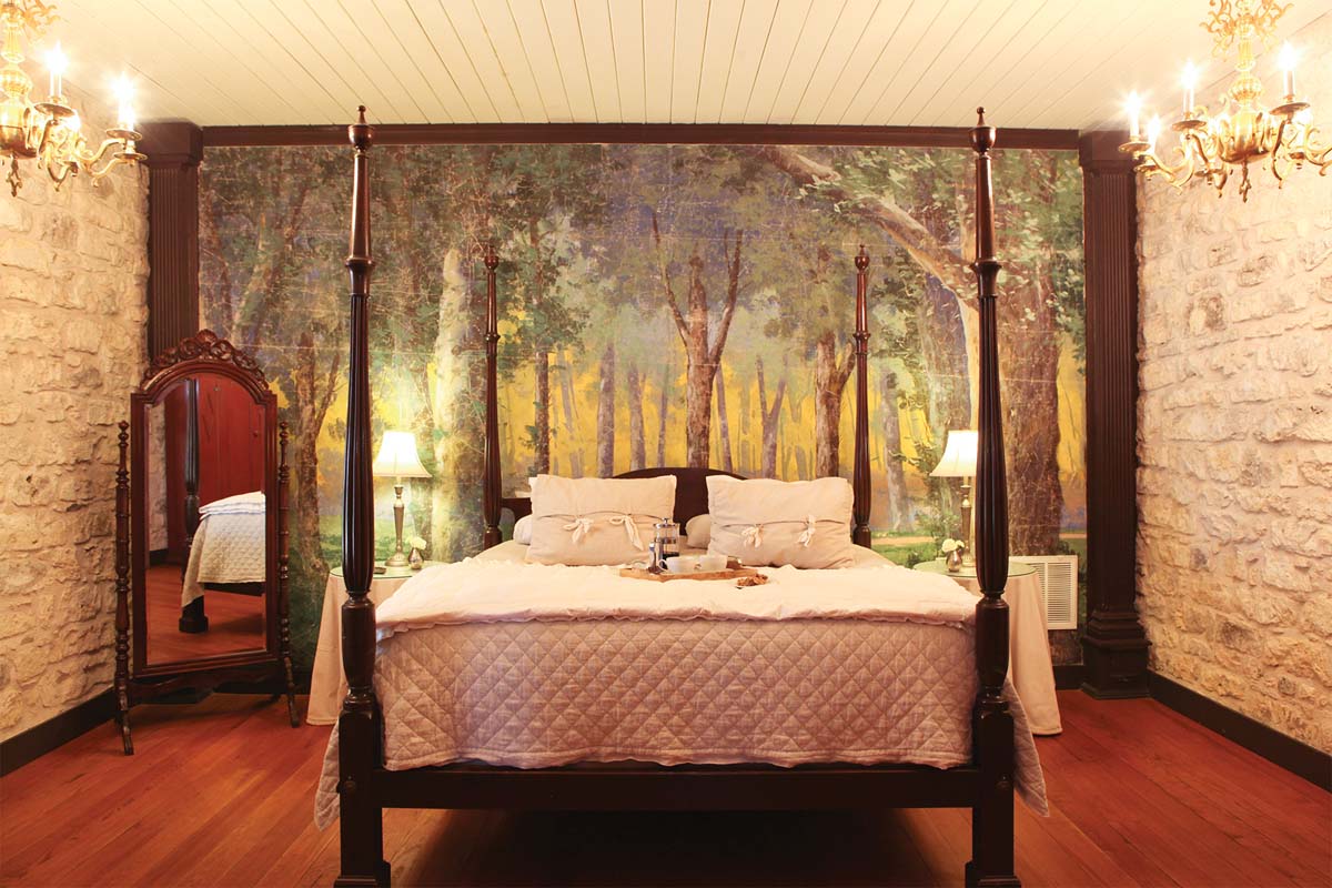 Hoffman Haus, a compound of new and old, offers a variety of cottages, suites and rooms. The Basse House — the bedroom is shown at right — dates to 1871, and the painted theater backdrop is from the mid-19th century. Some of the other accommodations have more of a shabby chic ambiance similar to the one in the main building. Amenities include an on-site cooking school, and a variety of food and wine events are held throughout the year.