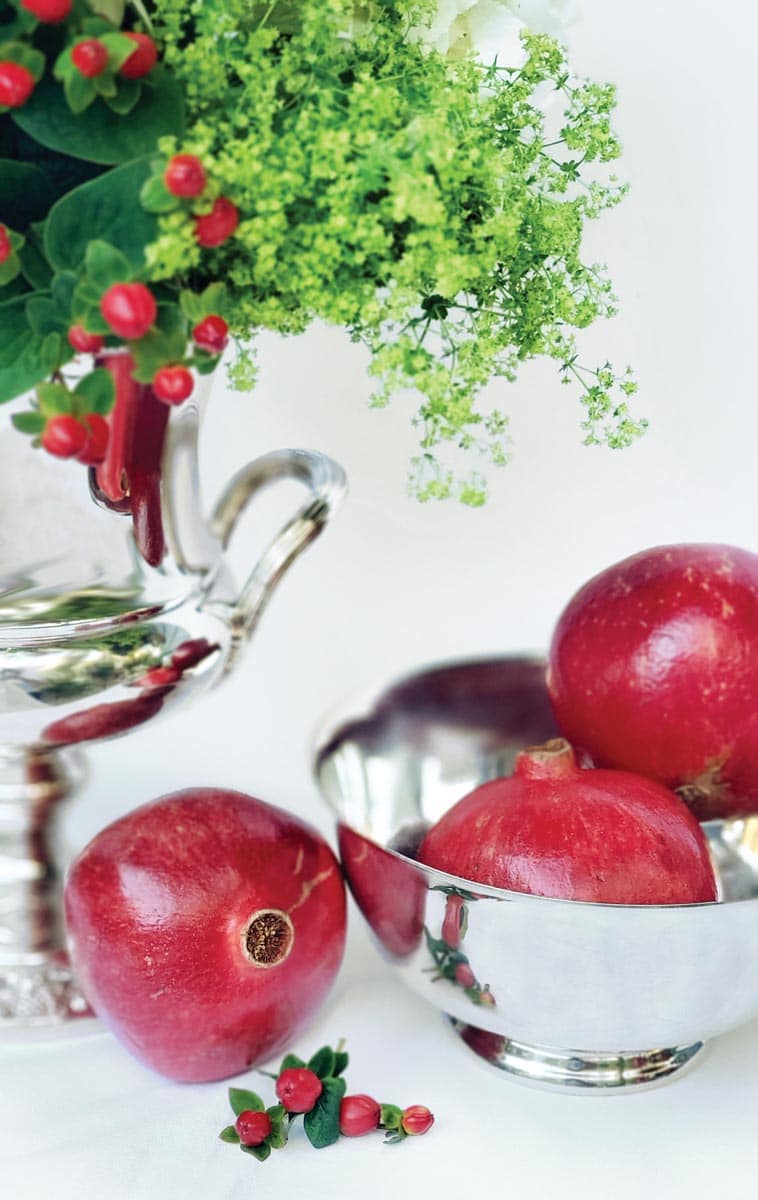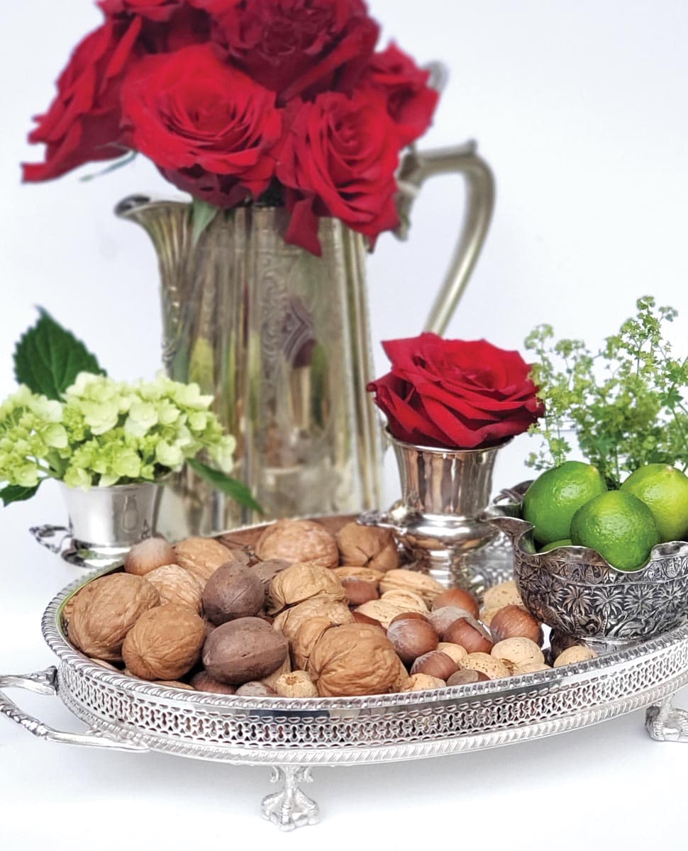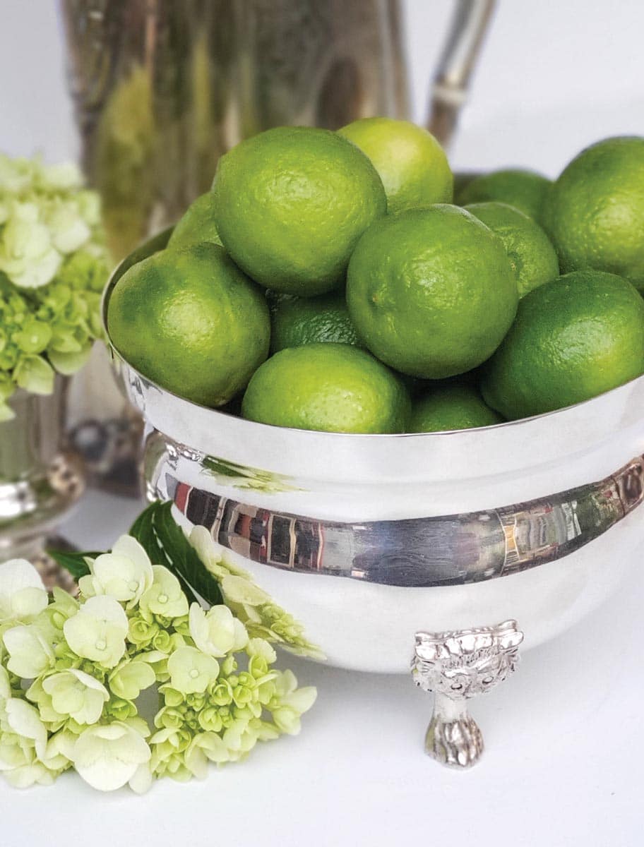 From ice buckets to small bowls, from teapots to footed trays, these pieces of silver are serving up a bit of glamour in adding sparkle and shine throughout your home. A champagne bucket makes a lovely container for a bounty of blooms, from a mass of hydrangeas to a loose arrangement of foraged evergreen branches.